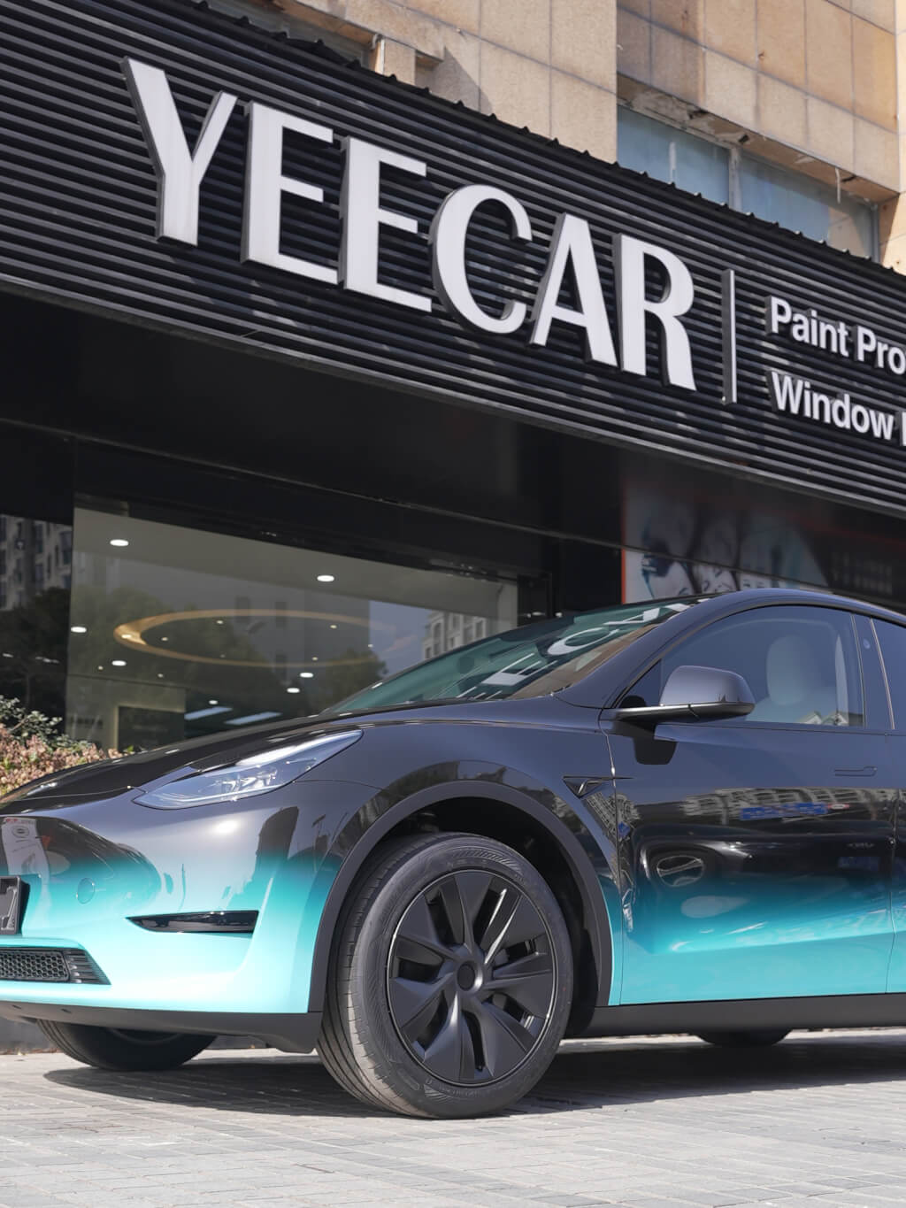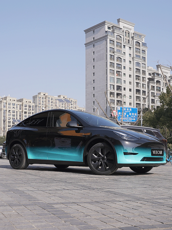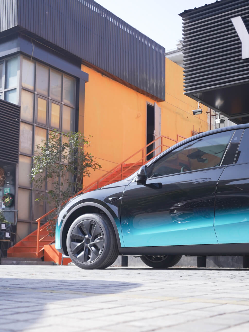 特斯拉Y装贴YEECAR定制渐变色,上下黑篮渐变色调,宛如将深邃神秘的夜空与波澜壮阔的深海巧妙融合,颜色个性又独特,每一寸车漆都氤氲着灵动的气息,开在路上回头率超高!
