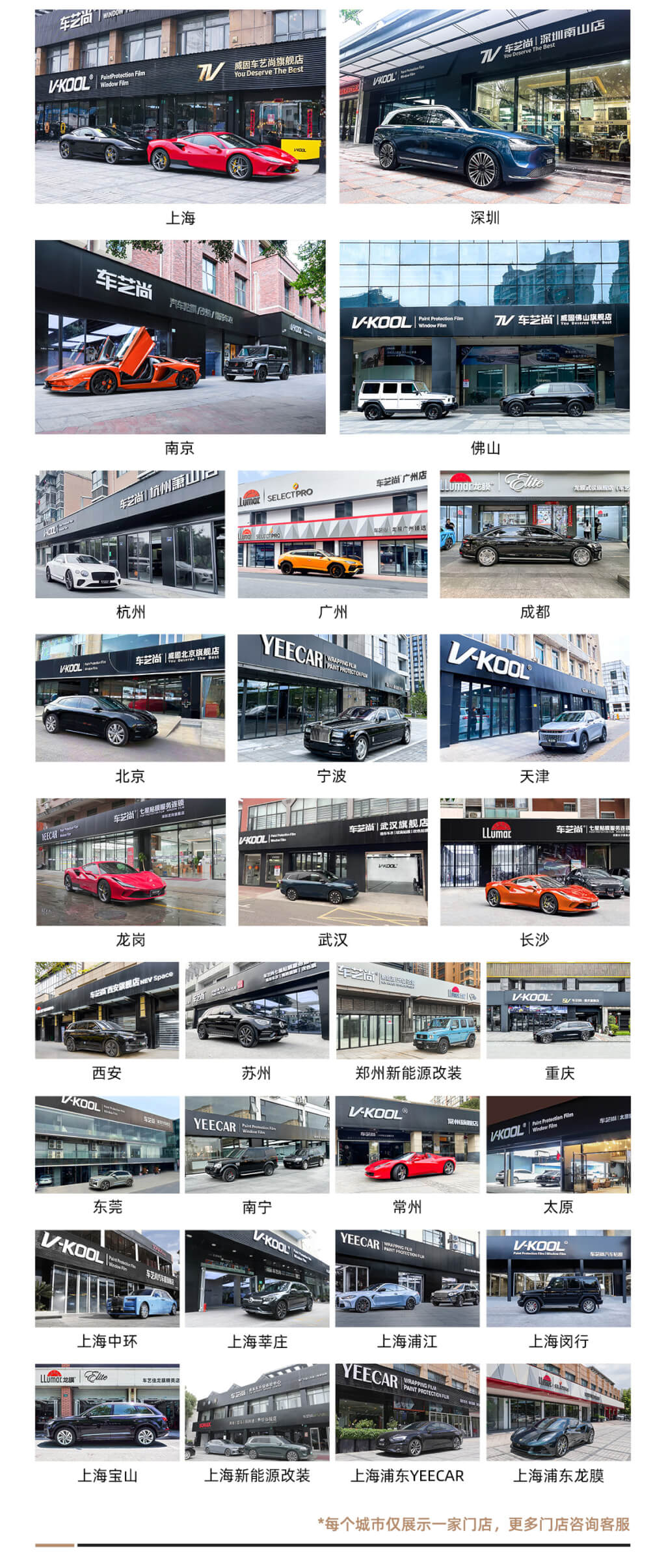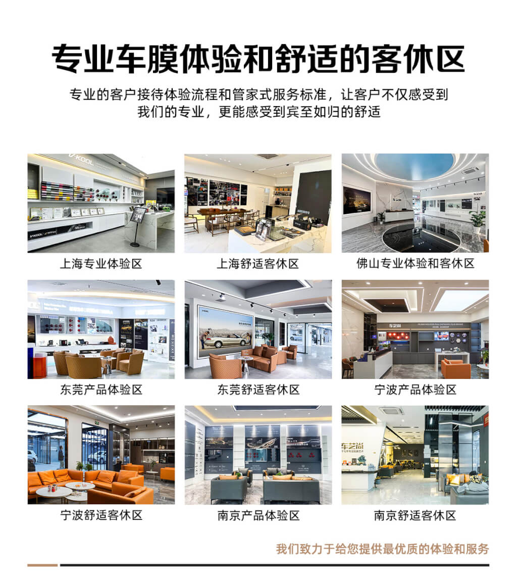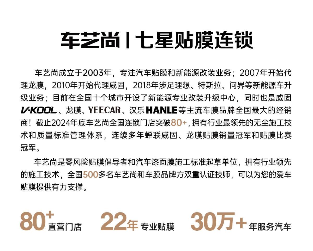 车艺尚 二十一年来专注汽车贴膜艺术,目前在上海、深圳、杭州、苏州、常州等地开设了五十余家直营门店,秉承 ”只贴膜、贴好膜“ 的服务理念,代理威固、艺卡、ROLIPS、龙膜、威铠尔等知名隔热膜、隐形车衣、改色膜产品,为客户带来 正品、安全、零风险 的专业贴膜体验,已为超过二十万台车主提供过高品质的贴膜服务。