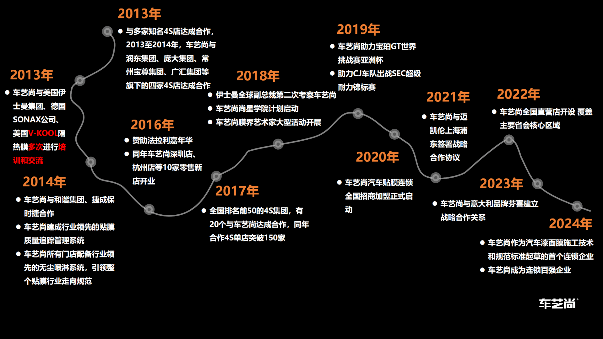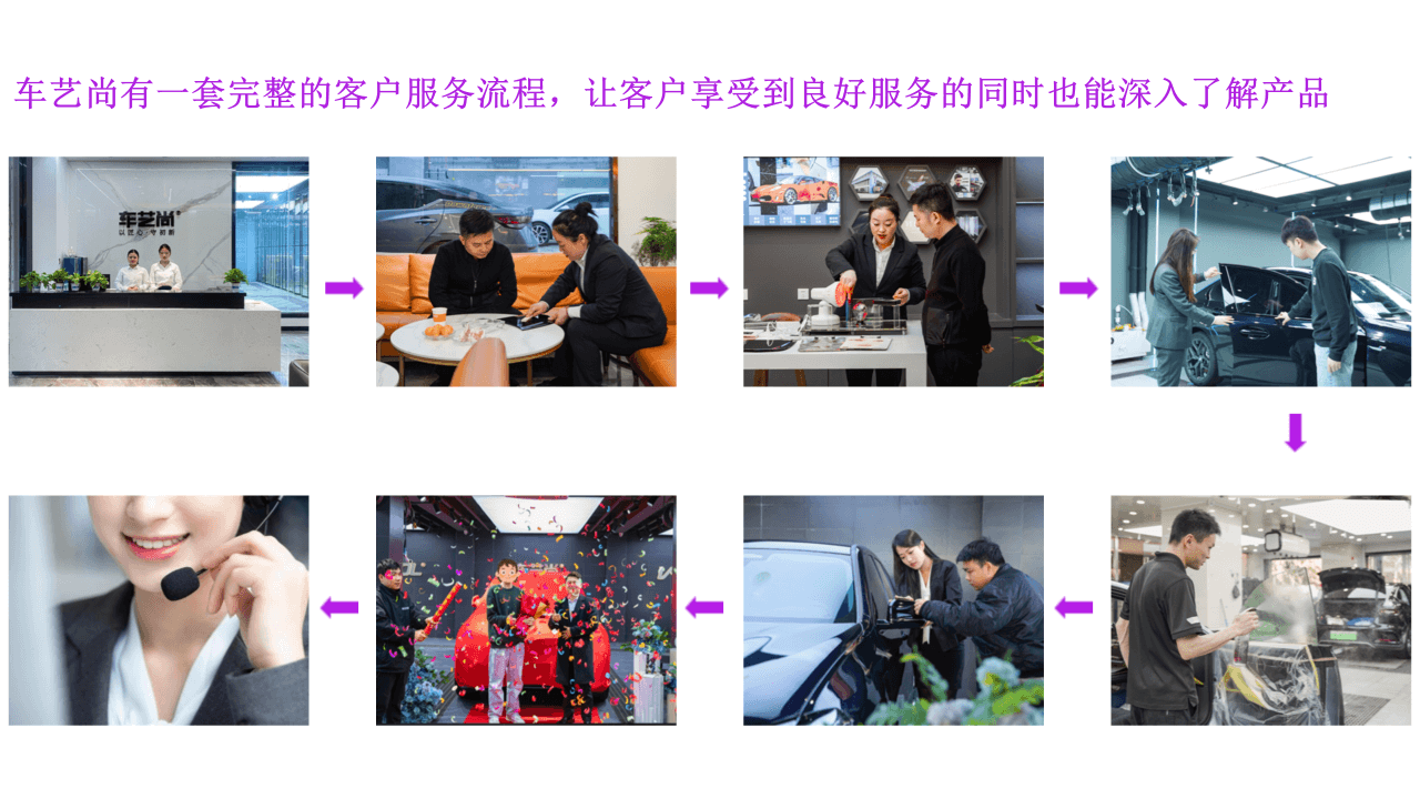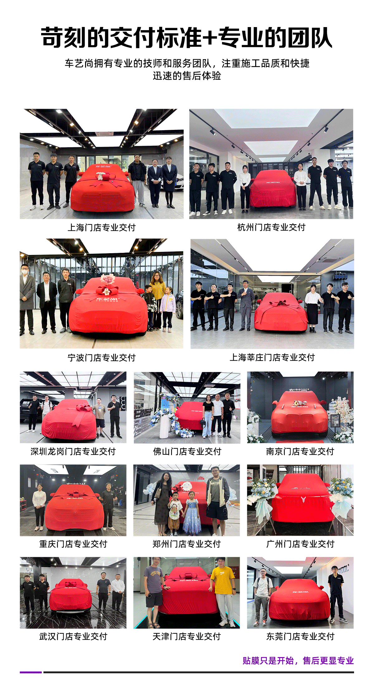 车艺尚根据旗下直营门店数百万用户实际装贴后的使用经验和反馈!根据产品稳定性和产品性能、长效性、抗污能力、耐久性、售后服务、品牌力等几个维度出发!为车主提供从“选品→体验→透明施工→交付→售后”的管家式贴膜体验。