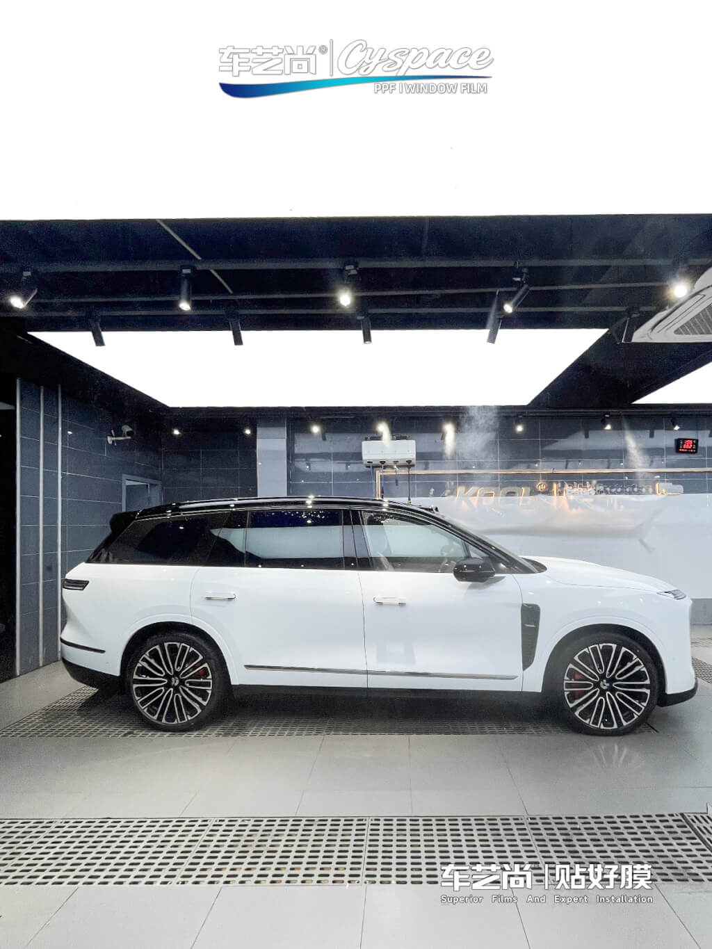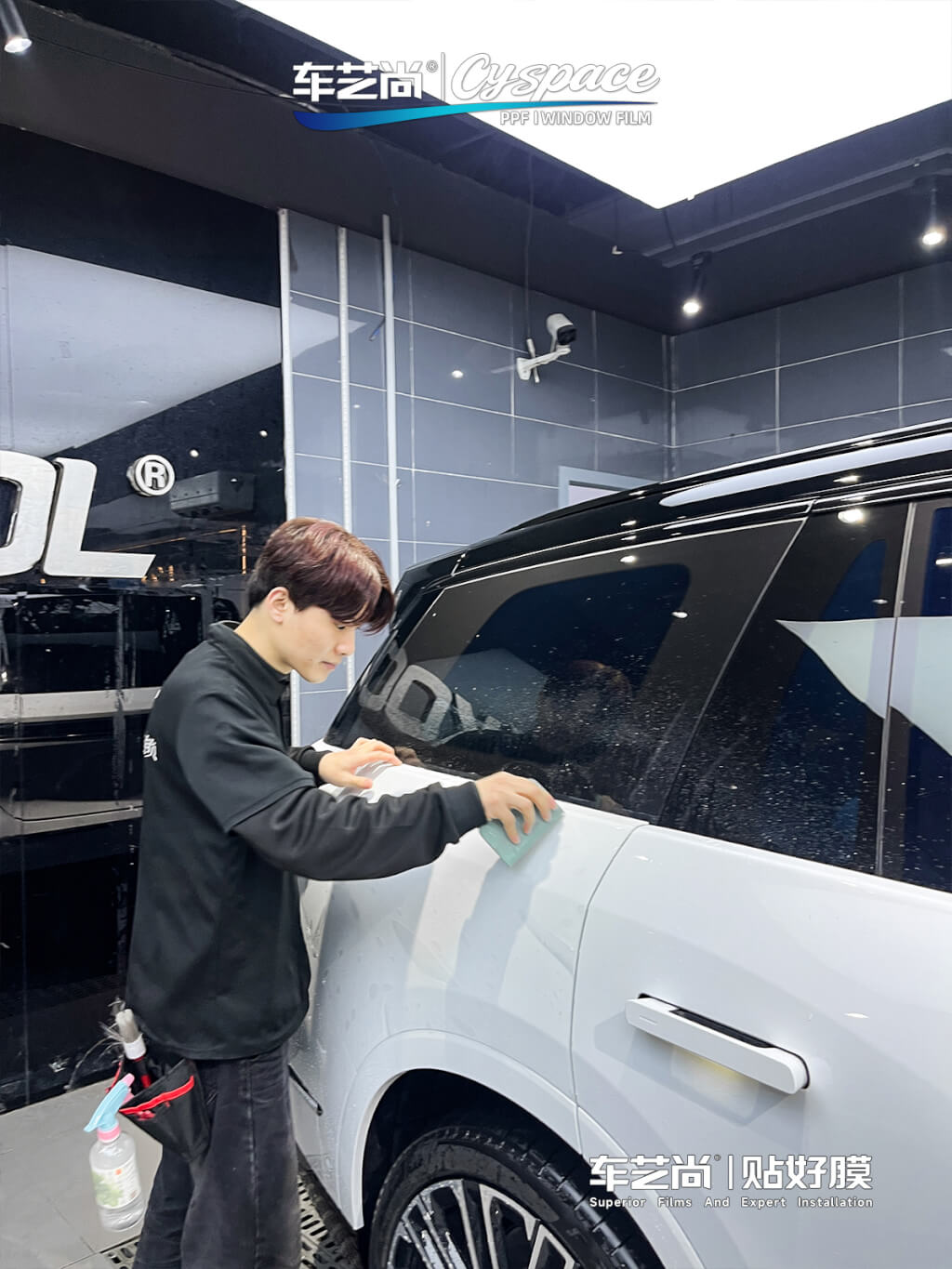 施工区采用上百个射灯加无影顶灯的组合,提供360°无死角的照明条件。同时配备了专业雾化喷淋降尘装置,模拟微雨环境,最大限度降低悬浮尘埃,将施工中气泡和后期卷边的风险降至最低。VIP休息区配备实时施工监控系统,车主可随时远程查看施工进度。