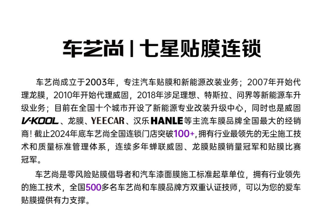 车艺尚成立于2003年,专注汽车贴膜和新能源改装业务;2007年开始代理龙膜,2010年开始代理威固,2018年涉足理想、特斯控、问界等新能源车升级业务;目前在全国十个城市开设了新能源专业改装升级中心,同时也是威固VKOOL、龙膜、YEECAR、汉乐HANLE等主流车膜品牌全国最大的经销商!截止2024年底车艺尚全国连锁门店突破100+,拥有行业最领先的无尘施工技术和质量标准管理体系,连续多年蝉联威园、龙膜销量冠军和贴膜比赛冠军。