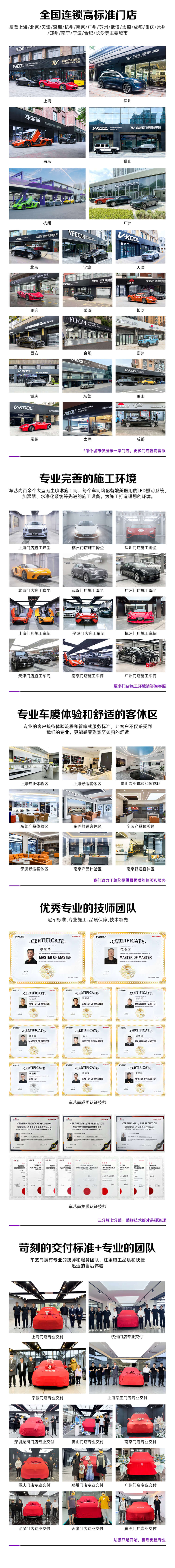 车艺尚 二十一年来专注汽车贴膜艺术,目前在上海、深圳、杭州、苏州、常州等地开设了五十余家直营门店,秉承 ”只贴膜、贴好膜“ 的服务理念,代理威固、艺卡、ROLIPS、龙膜、威铠尔等知名隔热膜、隐形车衣、改色膜产品,为客户带来 正品、安全、零风险 的专业贴膜体验,已为超过二十万台车主提供过高品质的贴膜服务。
