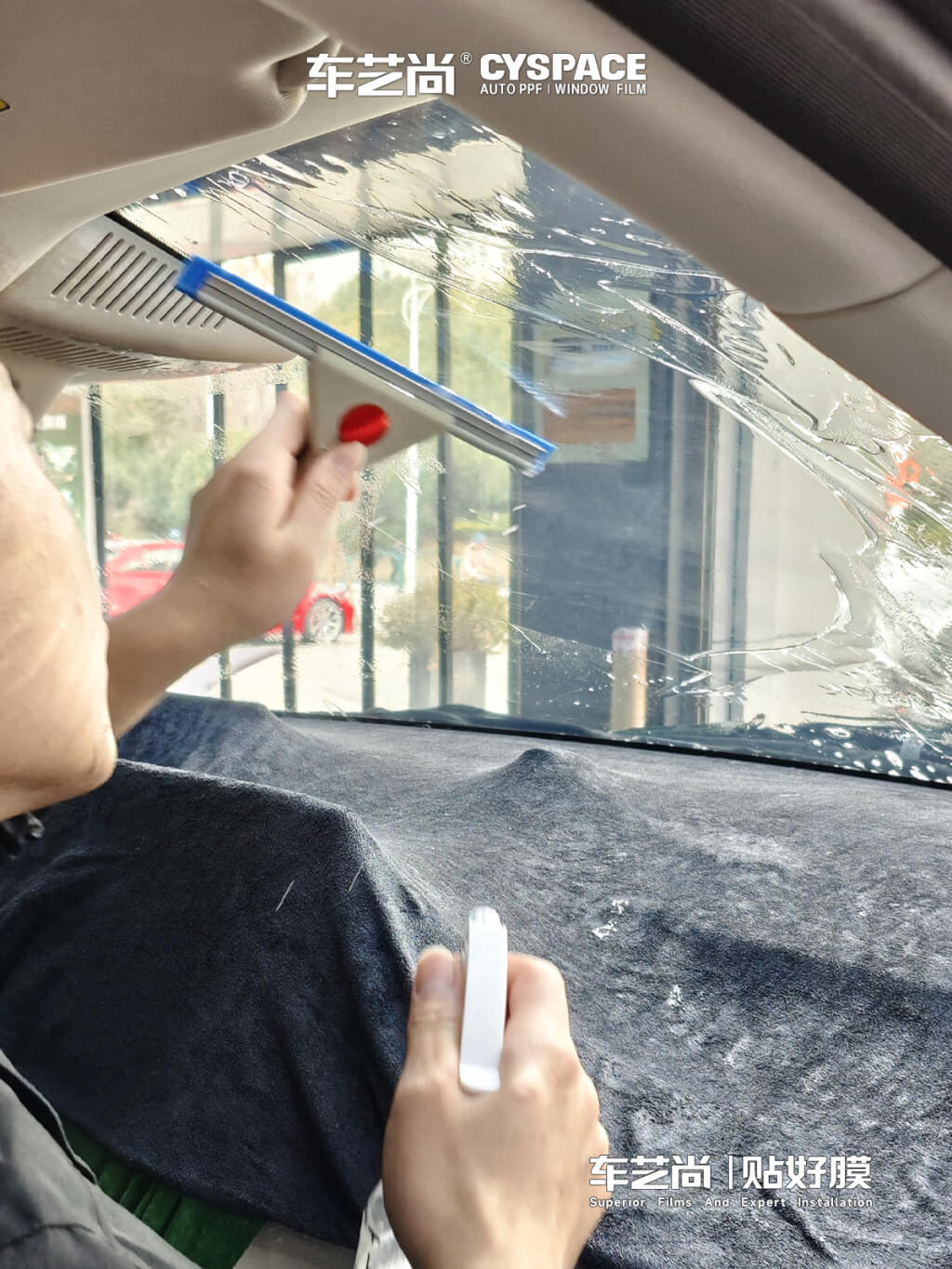 与此形成鲜明对比的是,车艺尚御水路店的施工流程中采用 “垫片裁膜” 技术——在美工刀片与车窗玻璃之间垫入一层极薄的特制垫片,刀尖始终不接触玻璃表面,真正做到“零接触、零风险”。这就从根源上杜绝了玻璃划伤和饰板损伤的风险,尤其对于智界 R7 这样格外讲究精密配装的新能源旗舰车型而言,垫片裁膜是比常规贴膜更让人放心的施工保障。