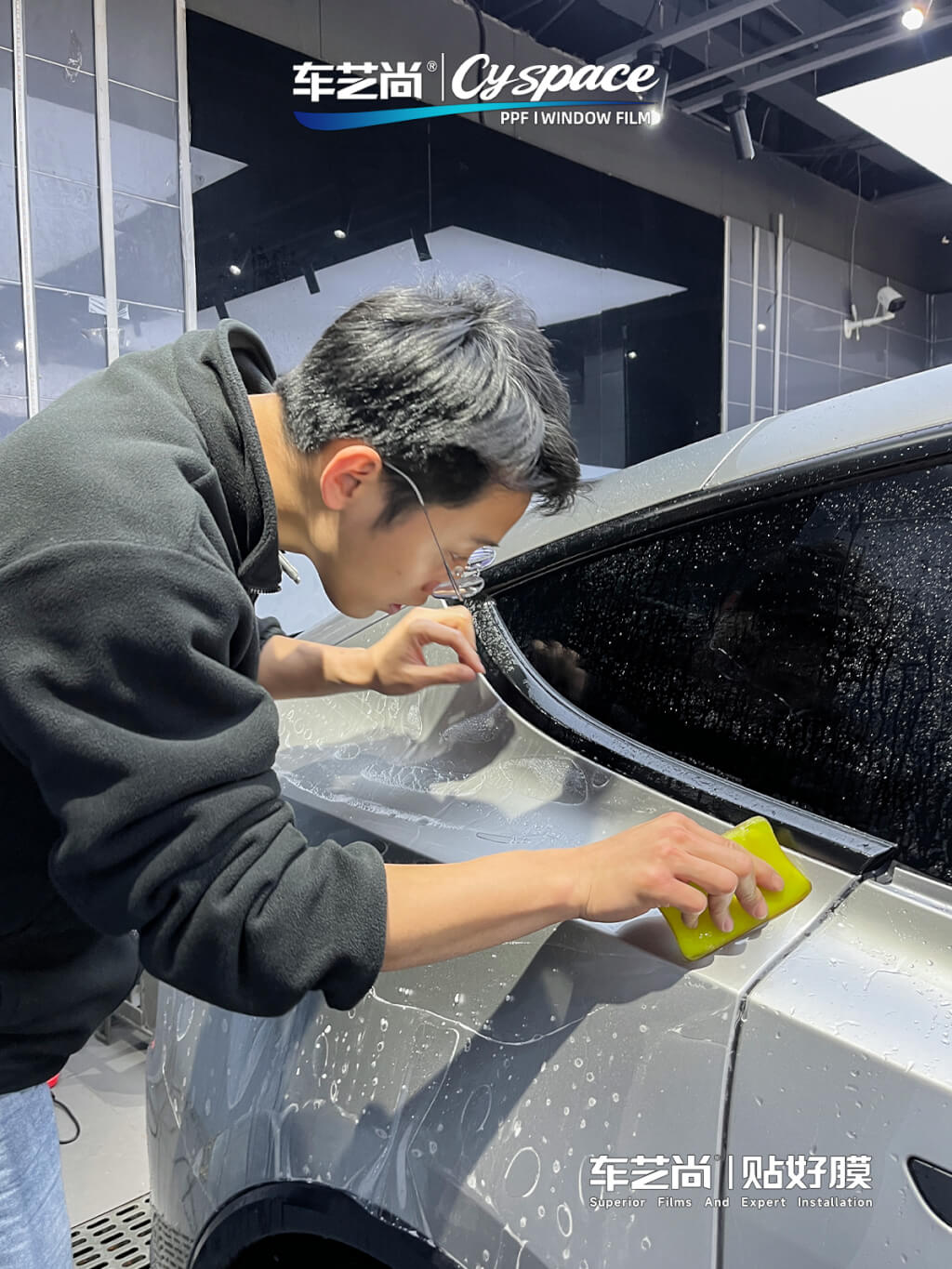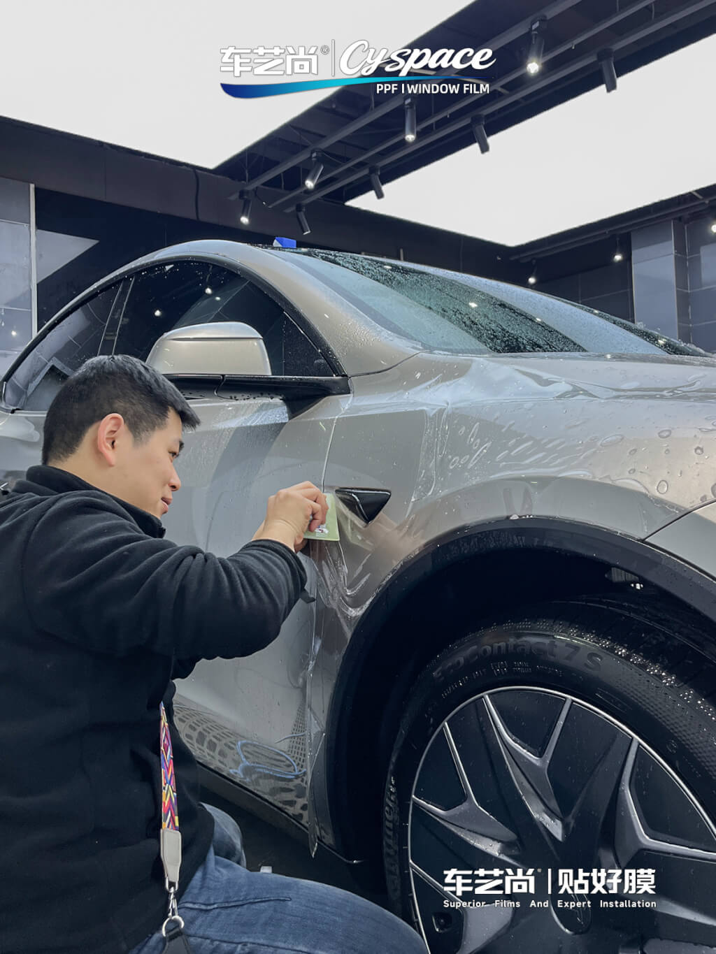 然而,再优秀的车衣,也需要一双巧手才能发挥出全部的价值。面对Model YL标志性的溜背造型车身、弧度极大的后视镜、复杂的保险杠曲面以及隐藏式门把手,车艺尚南京旗舰店的技师团队全程采用专车专用电脑裁膜系统,基于超十万工业模型的精准版型数据库,实现施工全程无需动刀、不拆件、无划痕,从核心工艺上规避施工风险。同时,为保证效果持久,技师团队对车门框、LOGO、前保险杠等易磨损、易翘边的区域,都通过毫米级手工包边工艺实现了所有缝隙车衣全部收到内侧的“隐形效果”,并向车主逐一复盘包边包角的耐久性测试,确保每一个接缝点都严丝合缝。