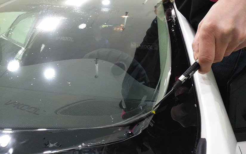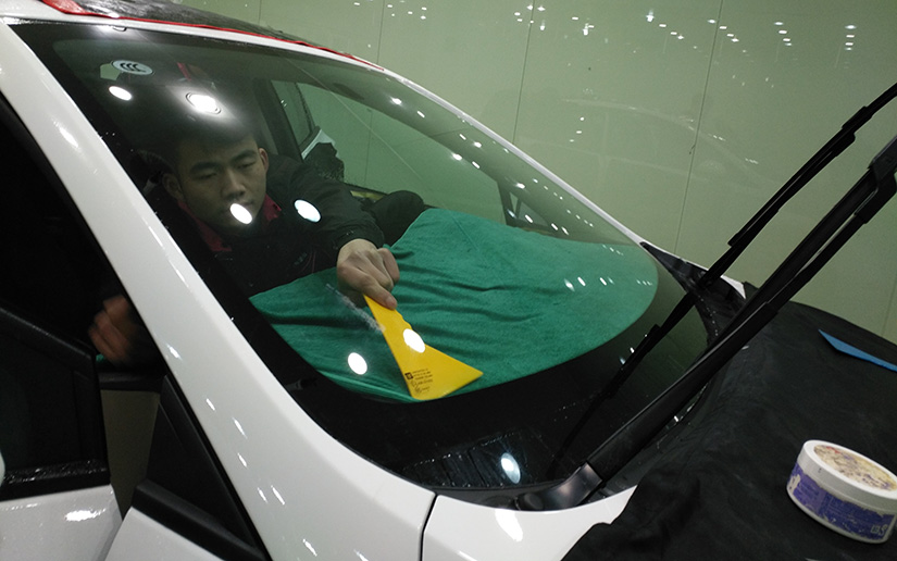 ● 前档贴膜施工中,膜是贴在玻璃里面的