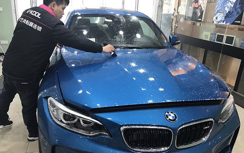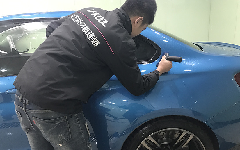 ● 技师刮去膜与车漆间的水渍,使之完全贴合