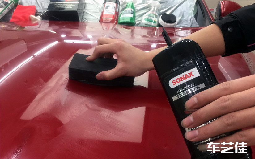 ● 施工后,车艺佳技师会额外再在车漆表面打上SONAX的漆面锁定蜡,是为了更好的提高车漆硬度,保持镀晶的使用寿命