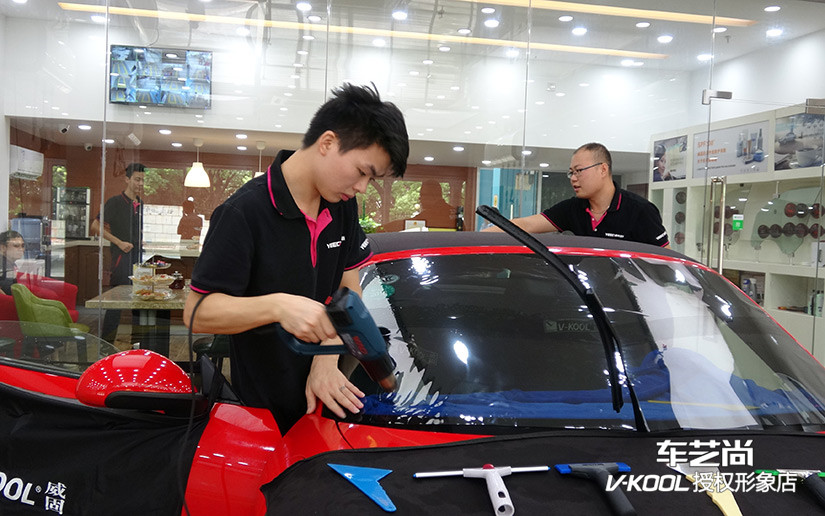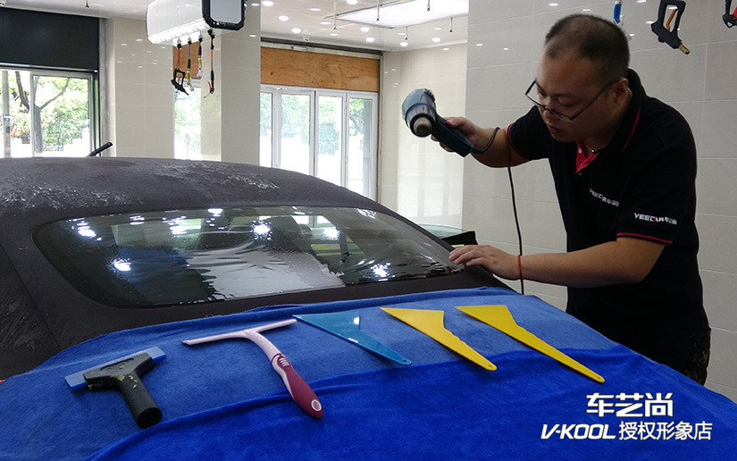 ● 前档烤膜施工,德国进口博世恒温烤枪,避免玻璃受损伤