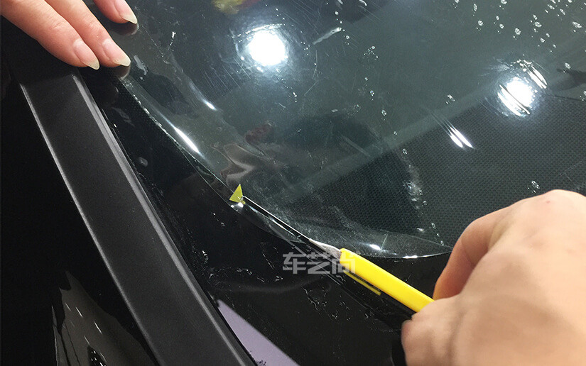 车艺尚玻璃膜施工采用垫片裁膜技术,避免刀尖与玻璃直接接触,保护爱车原车品质,只裁膜不伤车!