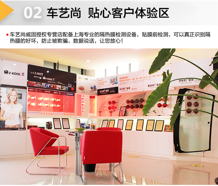 车艺尚汽车贴膜连锁是扎根于上海的专业贴膜品牌,是威固玻璃膜、龙膜隐形车衣、冠蝶隐形车衣等主要品牌在上海的授权运营商!目前旗下有9家品牌方授权直营店面,主营汽车贴膜和漆面隐形车衣。公司有华东地区专业的技师团队,以及从推广、销售再到施工和售后的管家式服务体系!我们的核心服务是通过严谨专业的施工品质,为车友提供汽车贴膜安装服务典范!在汽车后市场树立专业的品牌形象和人文风格!目前拥有6家专营店:浦东官方体验店、吴中路店威固专营店、浦西宝山威固形象店、莘庄威固形象店、金桥威固形象店、徐汇威固形象店!