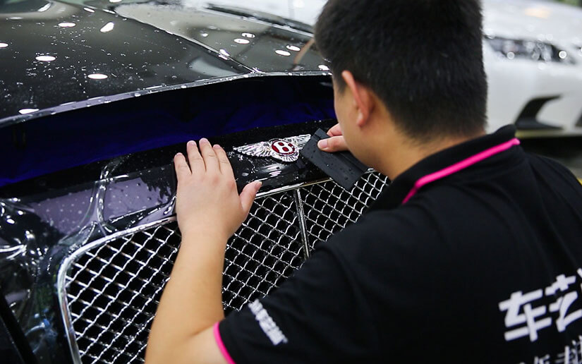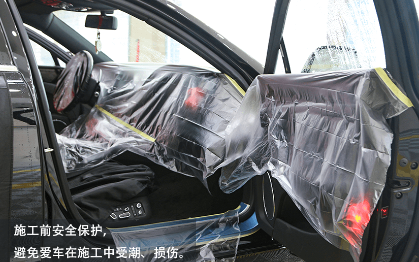 车艺尚威固标准贴膜施工,全车贴膜仅需500ml微水量,防止前挡操作台和车窗下方的电子配件进水导致车辆故障,同时也能够避免用水过多内饰受潮。