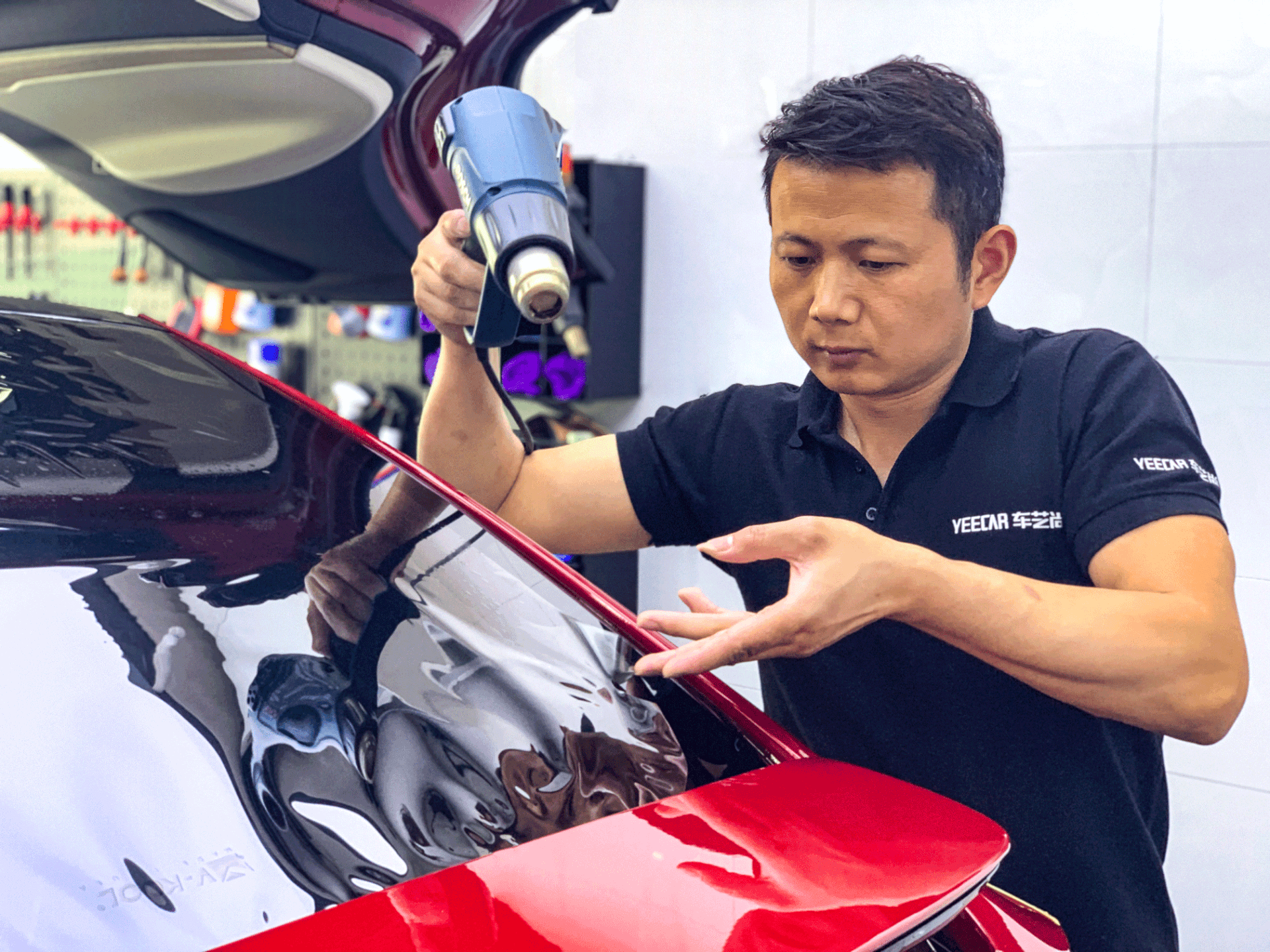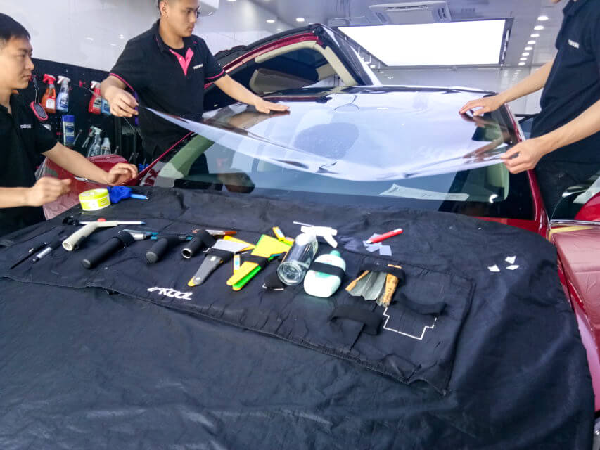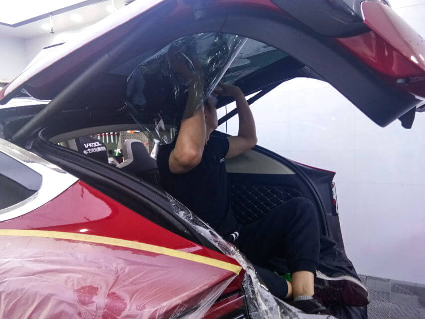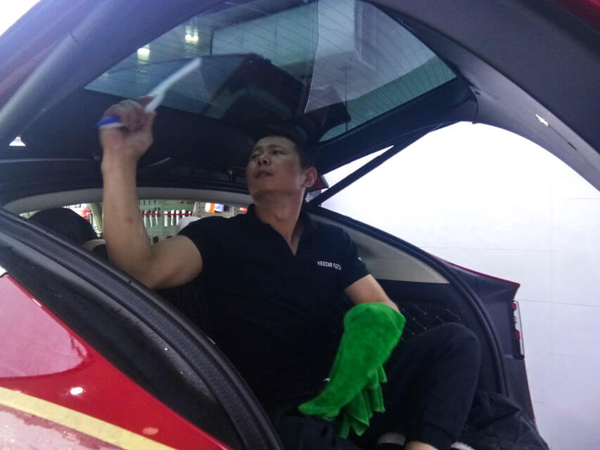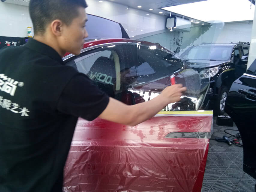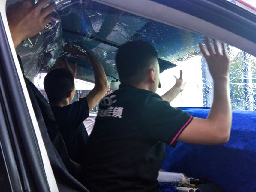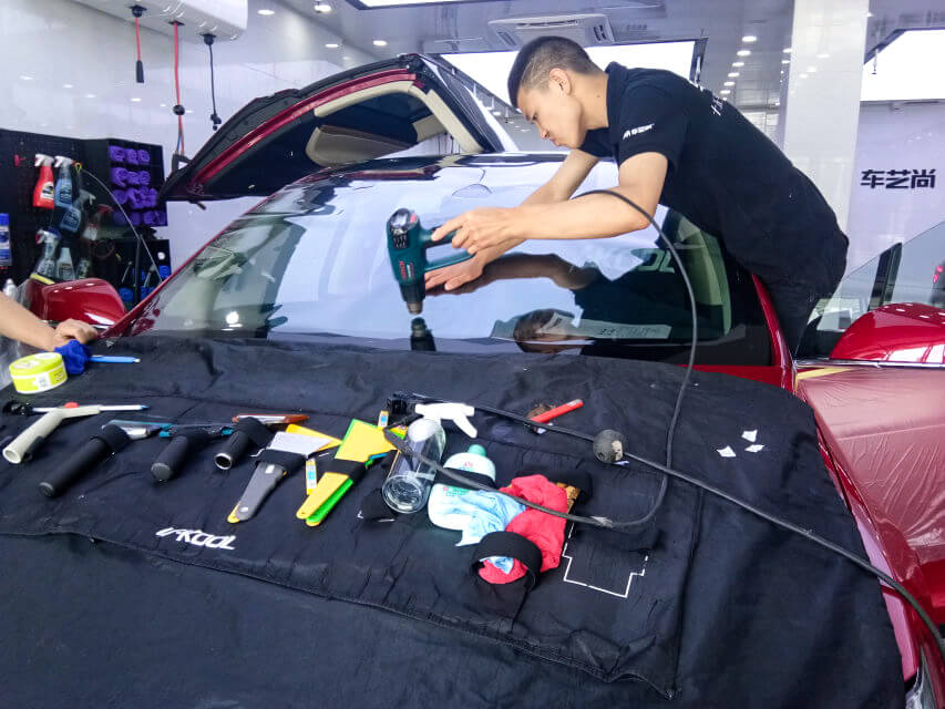 车艺尚技师不同施工部位采用不同的赶水手法与工具,确保膜与玻璃的充分贴合,无气泡、无翘边。