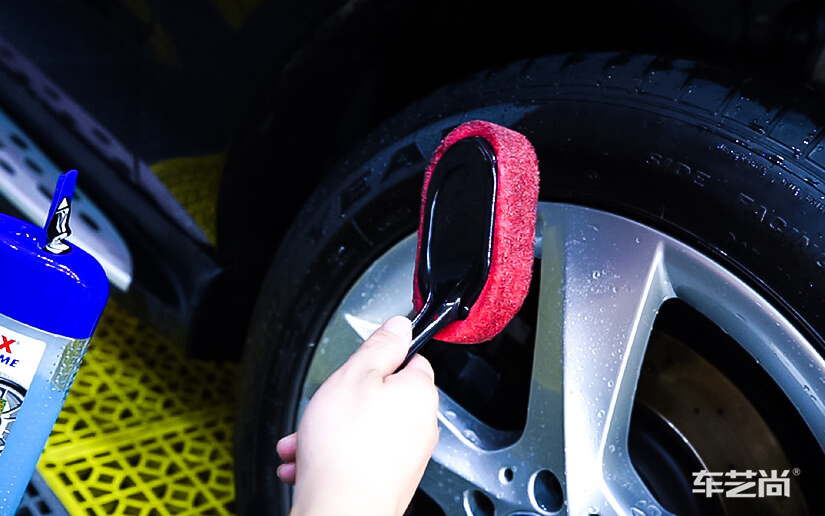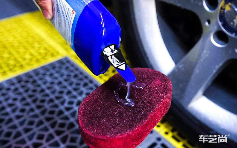 轮毂擦拭干净后,把轮胎上光蜡涂抹在海绵上,对轮胎均匀涂抹(上光必须覆盖整个轮胎三分之一的面积);