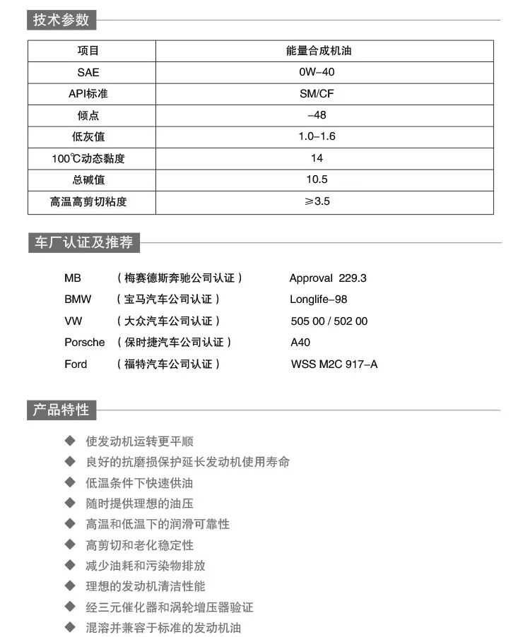 符合LONGLIFE 01或04以上认证的0W30/5W30/0W40 5W40