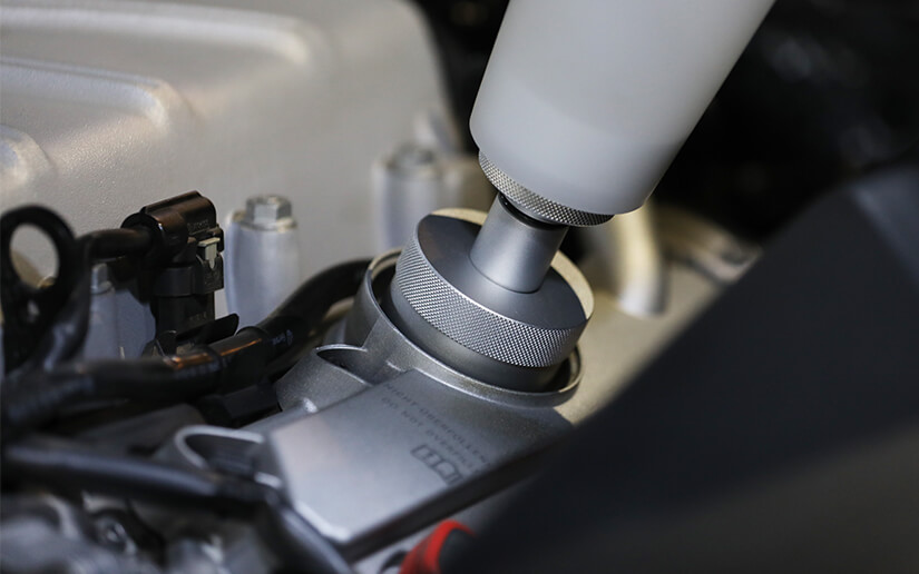 我们配备了能匹配市面主要的发动机加注口的机油加注器,拧紧螺丝和发动机的机油加注盖完全一样,严丝合缝,确保机油倒入的时候不会溅射