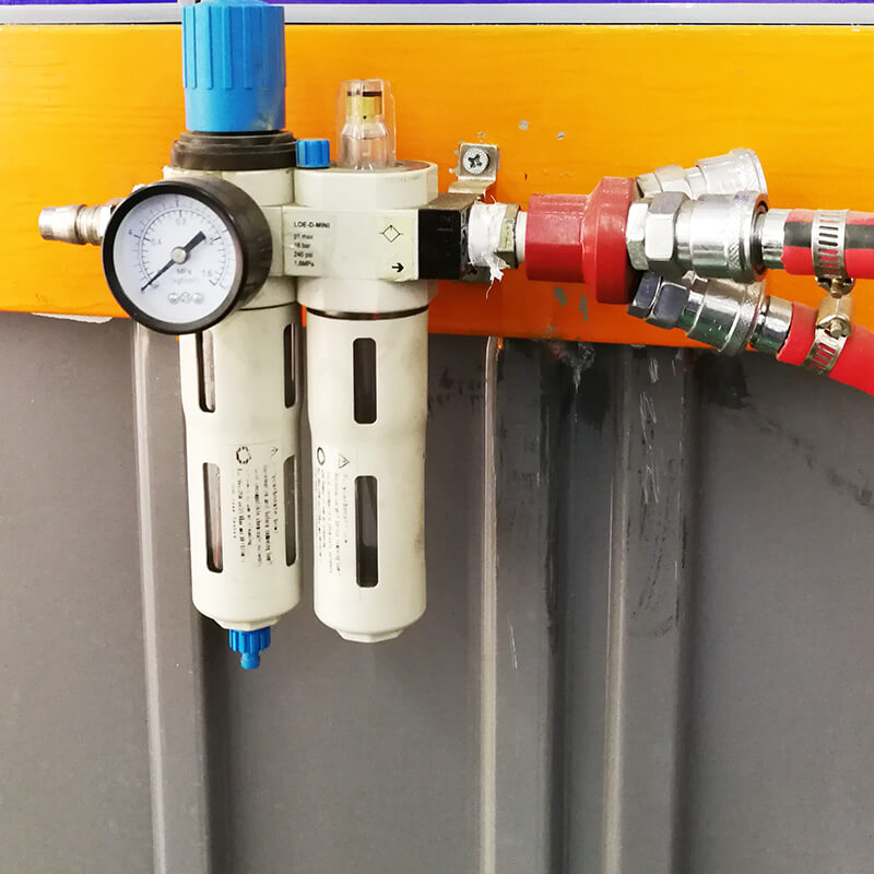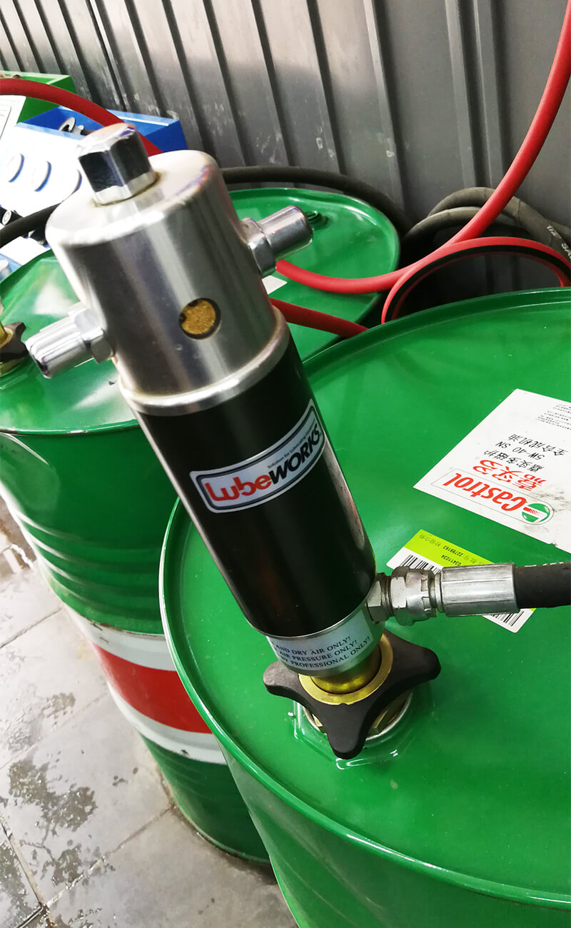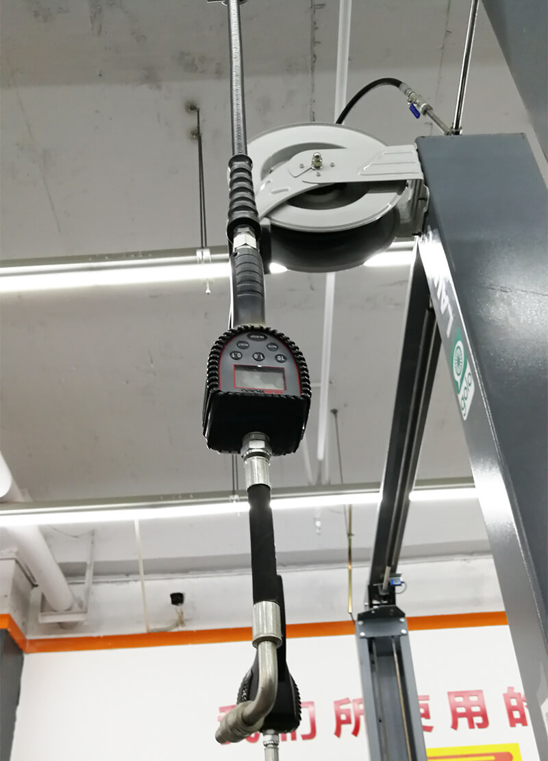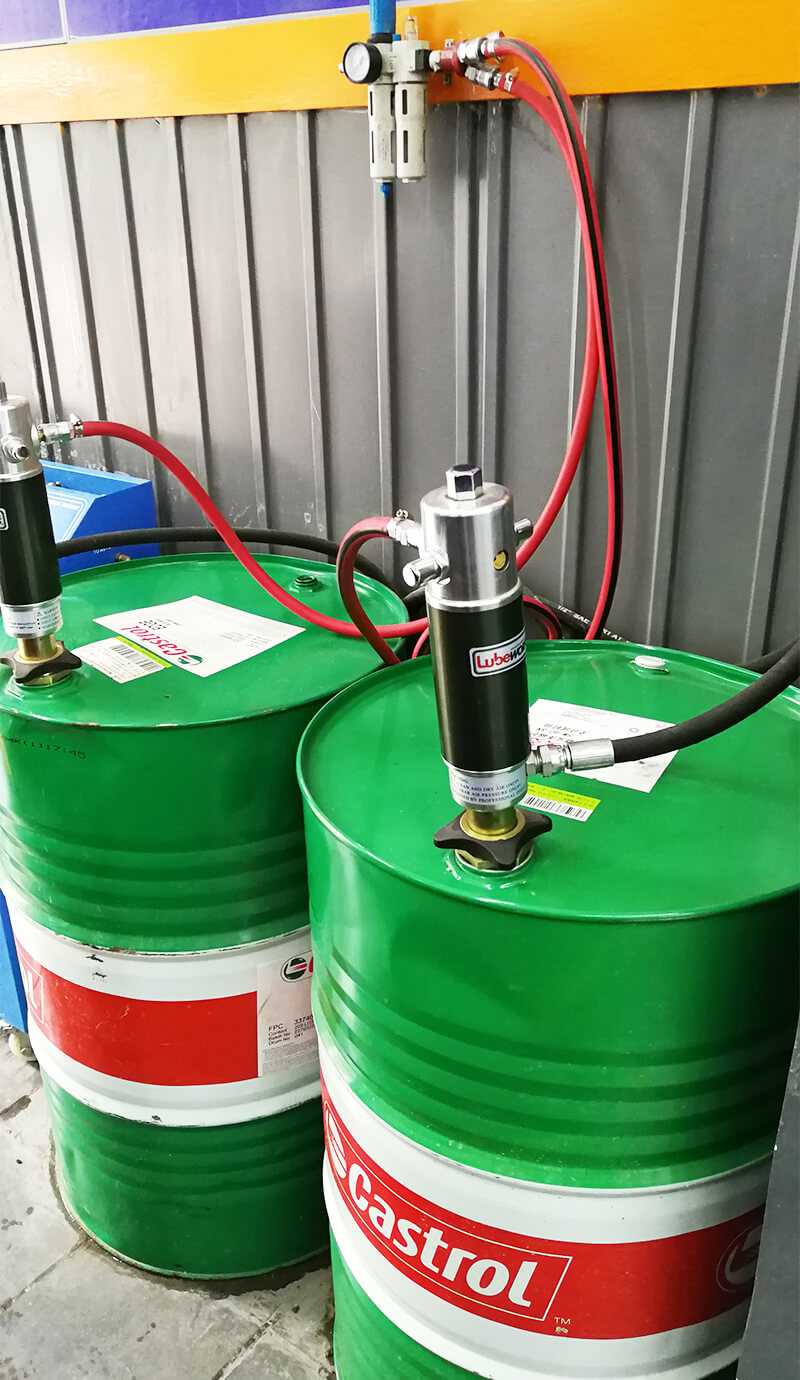 这一大桶机油能保养30-50台车,大桶机油桶链接外部管道直达另一头的抽油泵,直接再输送到计量仪器,再由计量仪器控制阀门到机油加注枪,从油桶链接管道到加注枪的距离很长,少则30米多则50米,容易汇入杂质