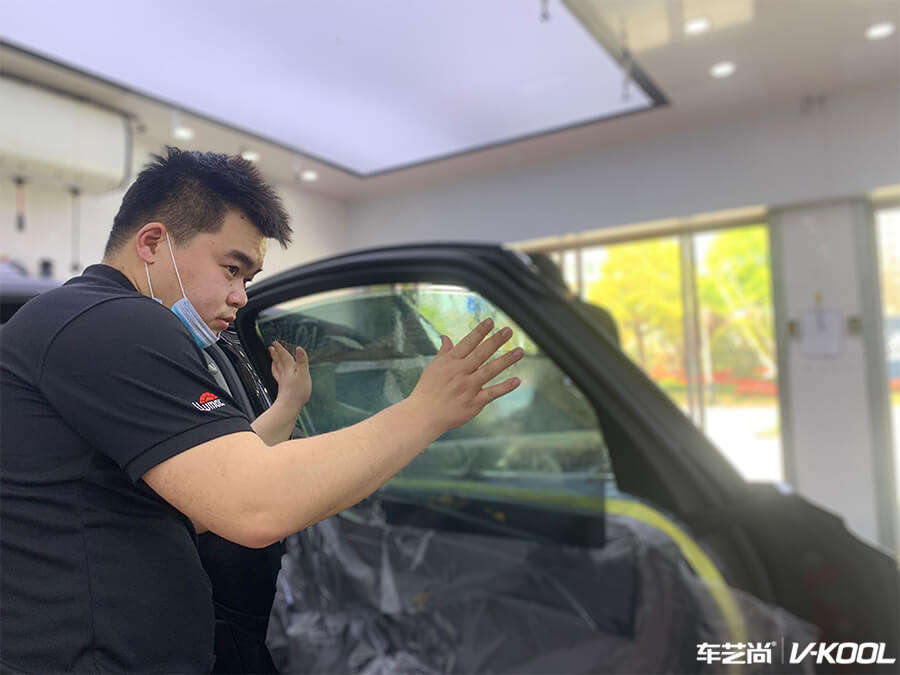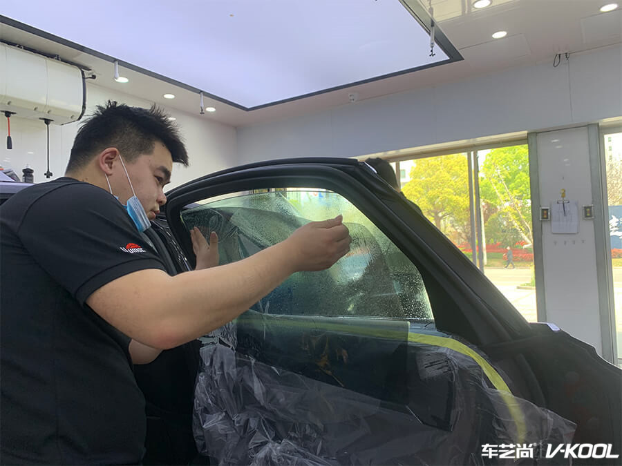 车艺尚技师不同施工部位采用不同的赶水手法与工具,确保膜与玻璃的充分贴合,无气泡、无翘边。rMFbdpm4EWfu-1586509422352.jpg