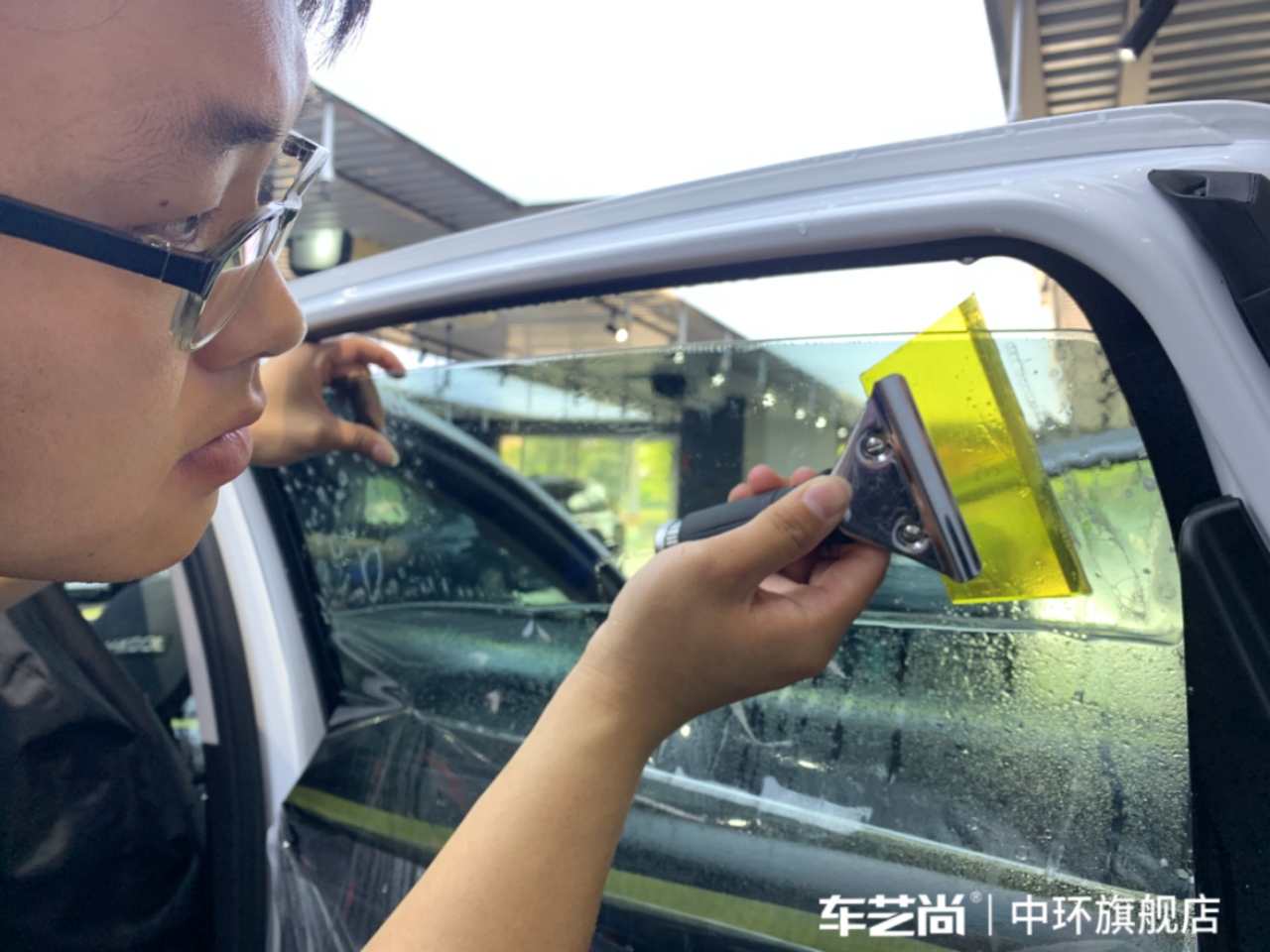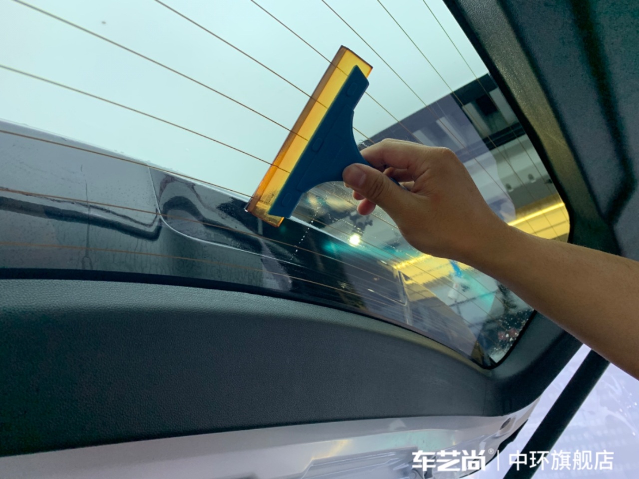 车艺尚技师不同施工部位采用不同的赶水手法与工具,确保膜与玻璃的充分贴合,无气泡、无翘边。