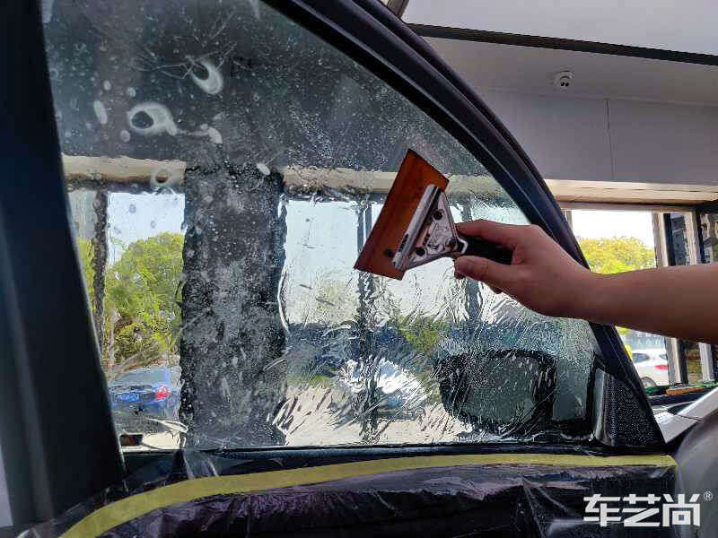 车艺尚技师不同施工部位采用不同的赶水手法与工具,确保膜与玻璃的充分贴合,无气泡、无翘边。