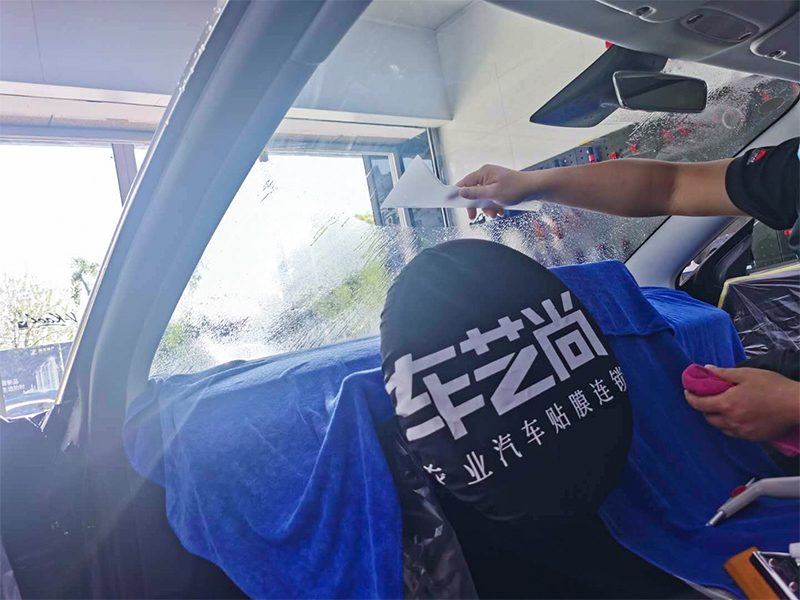 车艺尚技师不同施工部位采用不同的赶水手法与工具,确保膜与玻璃的充分贴合,无气泡、无翘边。