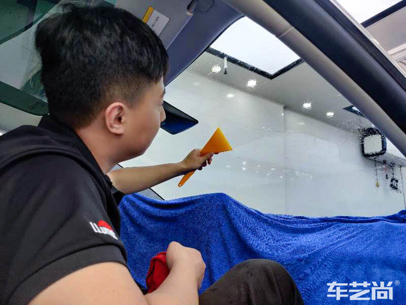 车艺尚技师不同施工部位采用不同的赶水手法与工具,确保膜与玻璃的充分贴合,无气泡、无翘边。
