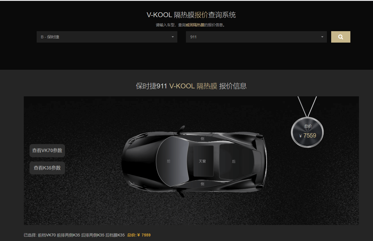 点击链接进入,选择对应的车型、车膜类型,点击查询皆可。报价系统提供的价格属于官方价格,一般会比实际贴膜价格高一些,但用来做参考已经完全足够了。