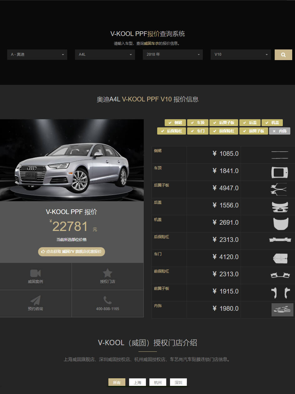 威固隐形车衣的价格,基本就是市场天花板了。我们可以以威固为基准,一窥市面上八成以上的车衣价格,车衣市场价格及行情一目了然。