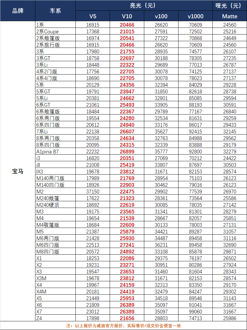 众所周知,威固隐形车衣都是一车一价的,即不同车型,不同型号,不同价格!今天,整理了宝马各车型/车系,全车装贴威固V5、V10、V100、V1000及哑光Matte型号的官方报价,现列表如下,拿走不谢!