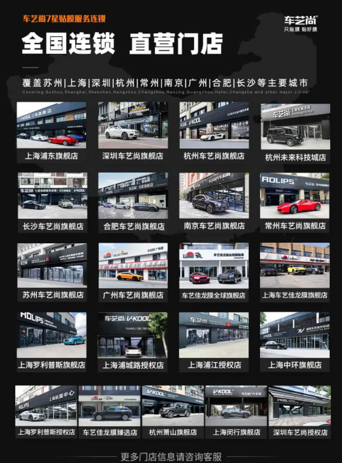 车艺尚在2003年成立,凭借精湛的贴膜技术,车艺尚是最早获得威固、龙膜等大品牌国内授权资质的那一批商家,目前总部位于上海,在杭州、深圳/南京/合肥/广州/常州/苏州等地也有连锁门店分布,共二十余家专业贴膜门店,同时车艺尚也是众多豪车4S店的指定合作商,如宾利、保时捷等。