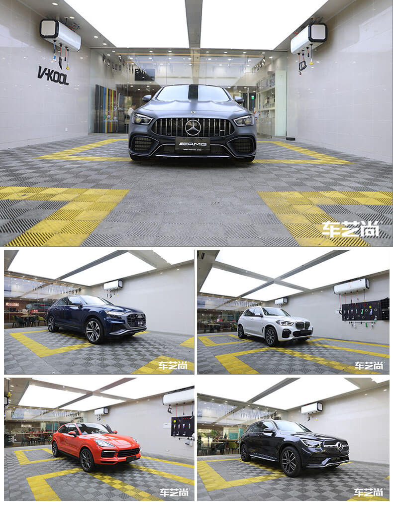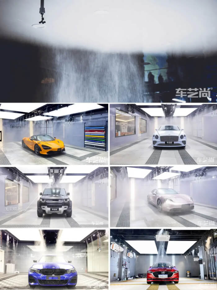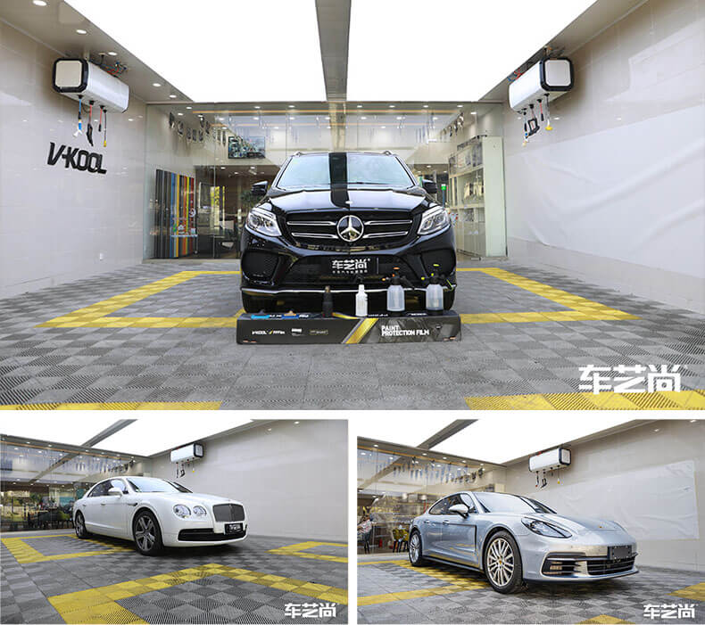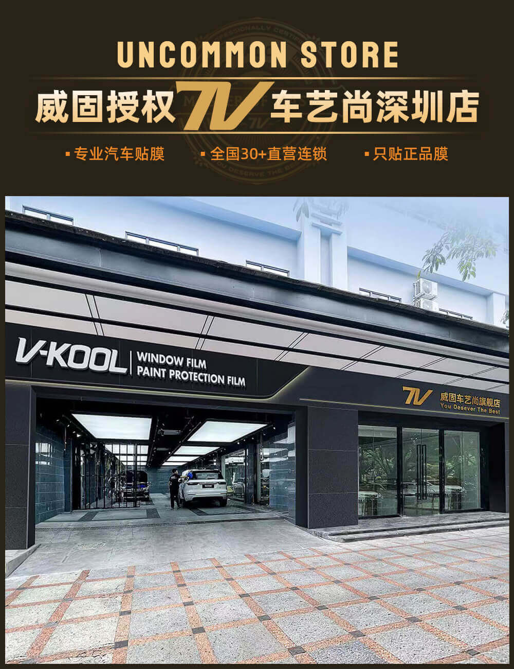 每个店都按照威固7V门店标准装修,喷淋系统、照明系统、雾化降尘、恒温车间,专业施工团队,专车专用裁膜系统,以及配备全套玻璃膜、隐形车衣检测设备,每一位车主在贴膜前可以检测对比产品性能