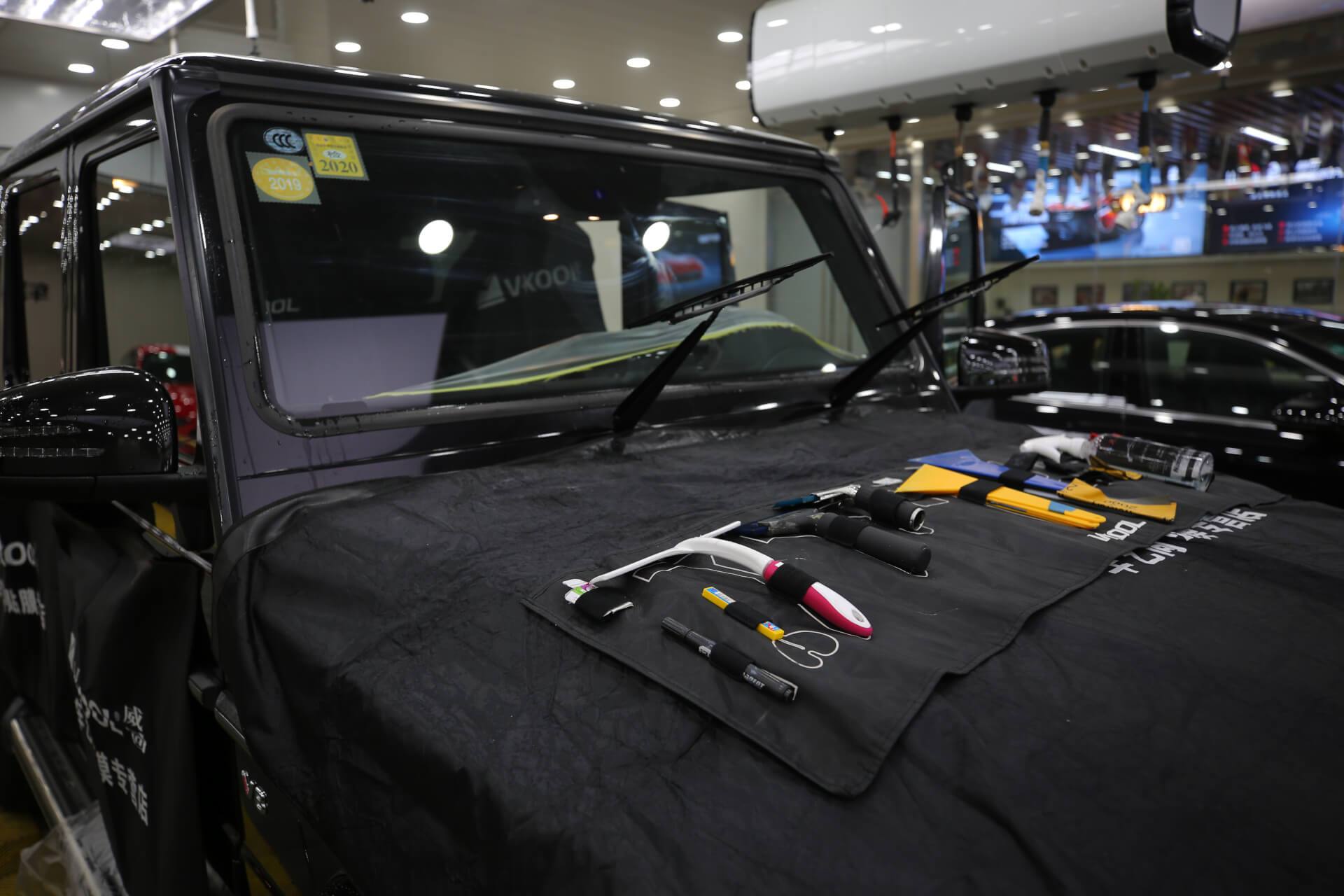 专业店面会有专业的贴膜工具,一般包括工具箱、烤枪、裁膜刀、各式刮板、毛巾系列、吸水布、喷壶、净水器等、除了这些他贴膜工具,还有专项使用的保护用品。