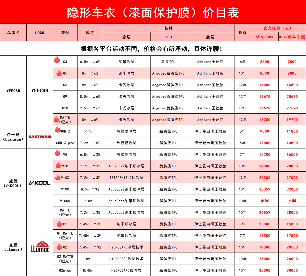通常威固、龙膜 车衣比较贵的,1.5w以上是主流型号,像威固v10、龙膜G2等。但是他们也有基础型号,即便是基础型号,性能远远超过国产高端型号,像威固V5、龙膜G1等。如果真的想贴性价比高的车衣,可以选择英国进口品牌YEECAR艺卡隐形车衣。主流型号艺卡G5车衣才八千多,厚度8.0mil,Argotec脂肪族TPU、Ashland压敏胶、纳米涂层,进口车衣品牌中的性价比之王。