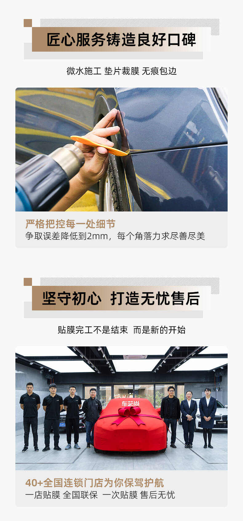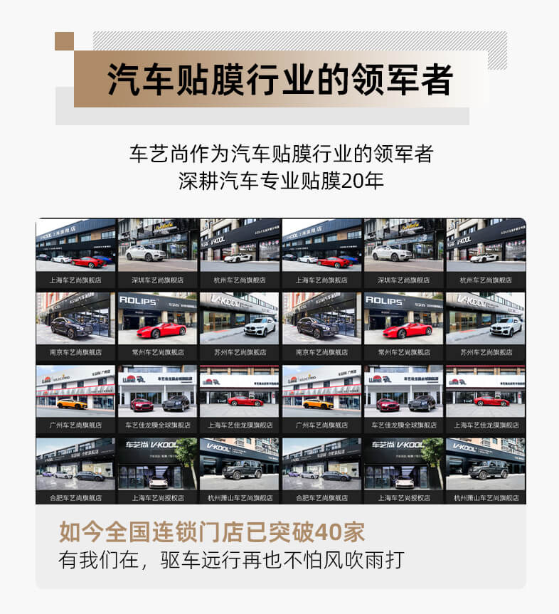 车艺尚汽车贴膜连锁,深耕汽车贴膜行业20年,2003年在上海开设的第一家门店,如今已经成为车艺尚汽车贴膜连锁总部,全国直营城市有40+,每个店都按照总店标准装修,喷淋系统、照明系统、雾化降尘、恒温车间,专业施工团队,专车专用裁膜系统,以及配备全套玻璃膜、隐形车衣检测设备,每一位车主在贴膜前可以检测对比产品性能,实现先体验后施工。