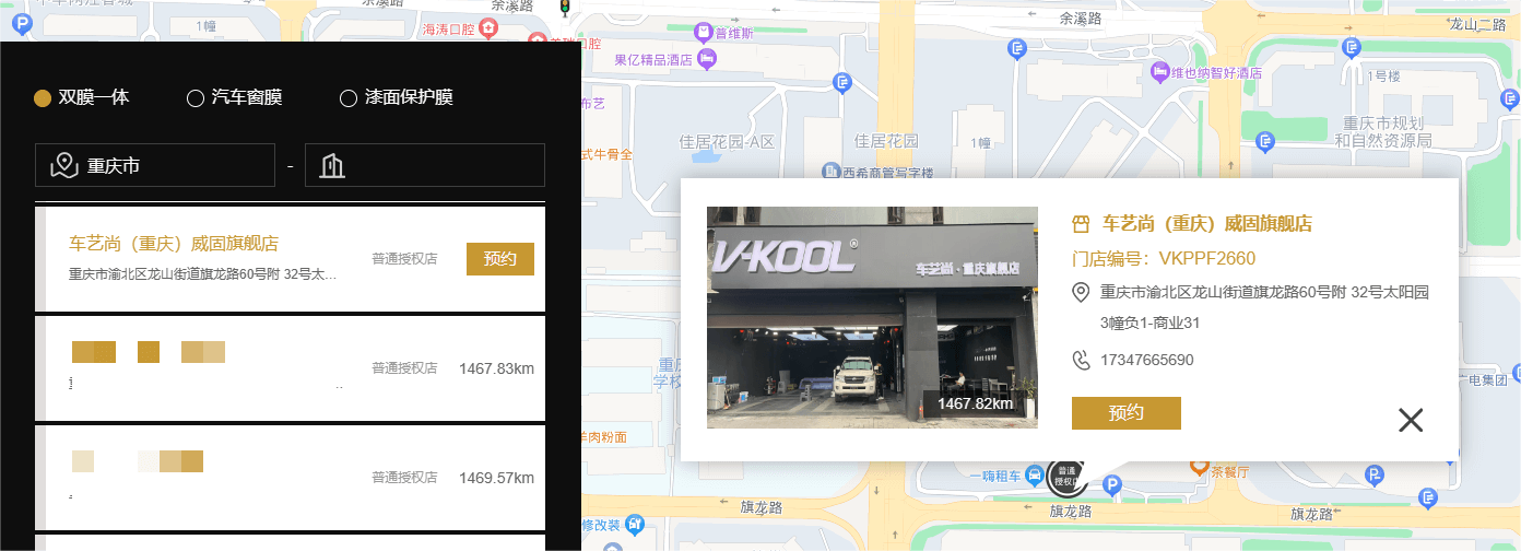 想寻找一家正规贴膜旗舰店其实很简单,先确定一个品牌,到品牌官网查询即可。像威固汽车膜一直是车膜界有名的高品质车膜,排在车膜市场首位。想在重庆找到威固贴膜正规旗舰店就到威固官网,地点选择重庆,直接查询即可。