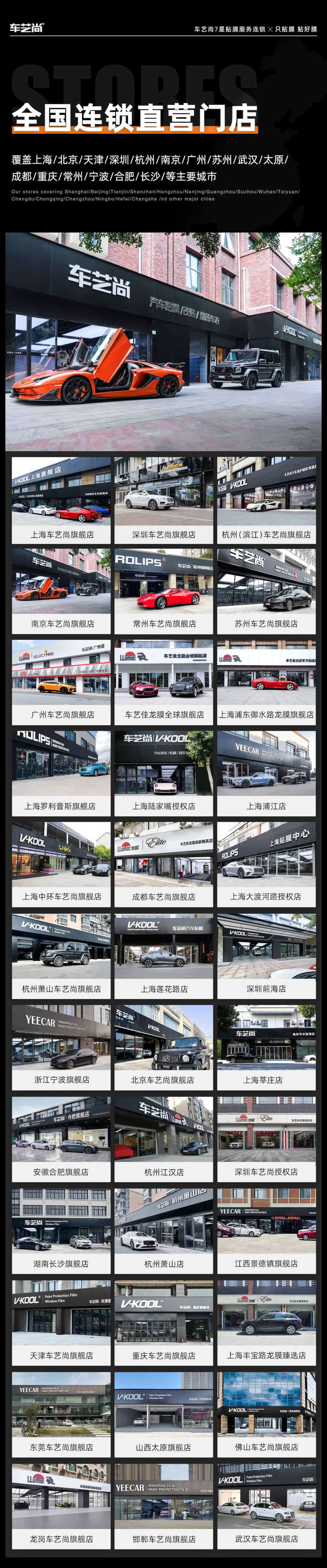 车艺尚在2003年成立,凭借精湛的贴膜技术,车艺尚是最早获得威固、龙膜、罗利普斯等大品牌国内授权资质的那一批商家,目前总部位于上海,在杭州、深圳/南京/合肥/广州/常州/苏州等地也有连锁门店分布,共四十余家专业贴膜门店。