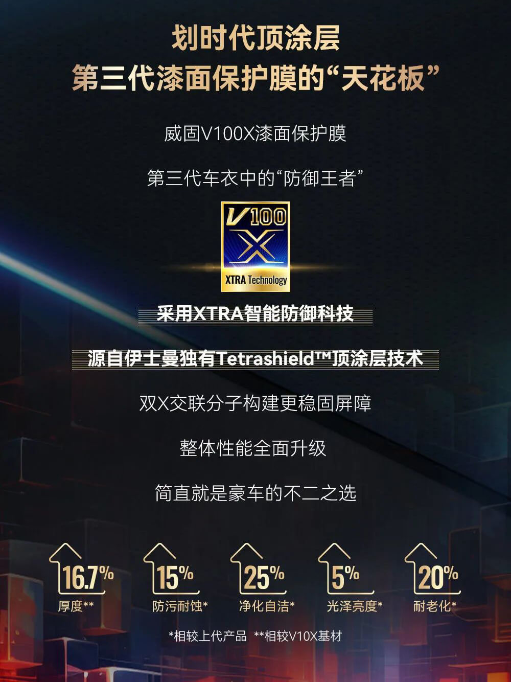 产品特点:第三代漆面保护膜再添新品!威固V100X漆面保护膜采用XTRA智能防御科技,源伊士曼独有TETRASHIELD?顶涂层技术,双X交联分子构建更稳固屏障,整体性能多方面升级,厚度大幅提升16.7%,抵御别蹭更耐穿刺!