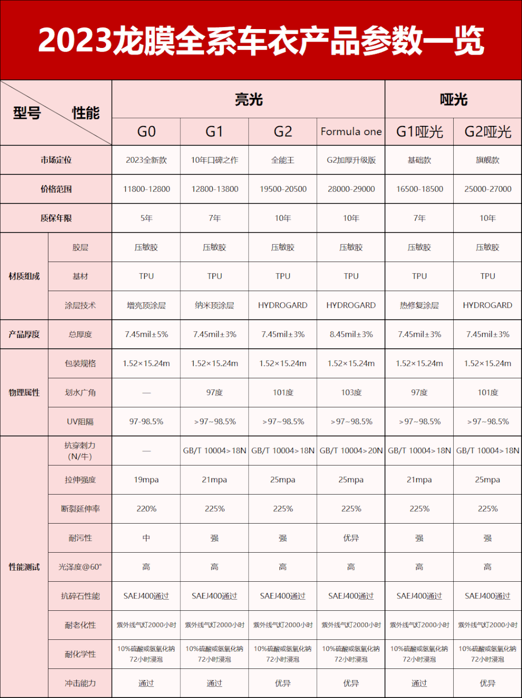龙膜隐形车衣大致可以分为两个系列:亮面款和哑光款。其中亮面款有sun-x、G1、G2、Formula One,哑光款有G1哑光、G2哑光1。而比较适合腾势D9的,比较推荐龙膜G2。