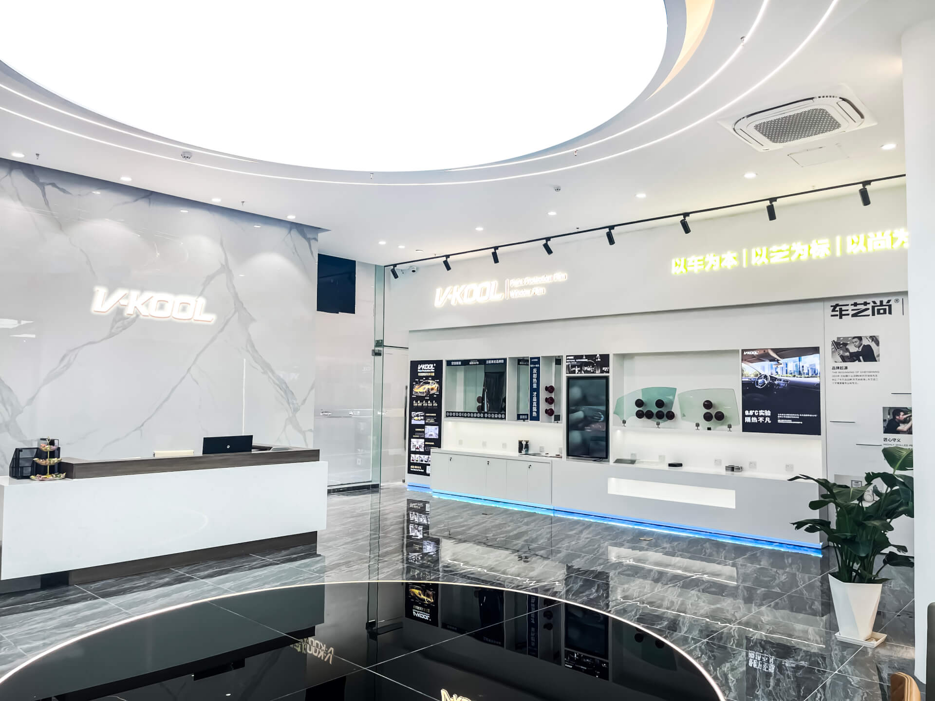 店内的装修风格一般也以黑色和灰色为主,配备无尘喷淋车间、检测区和休息区。车间宽敞明亮,喷淋设施齐全;检测区配备各种先进的检测设备,休息区比较舒适,凸显高端服务水平。