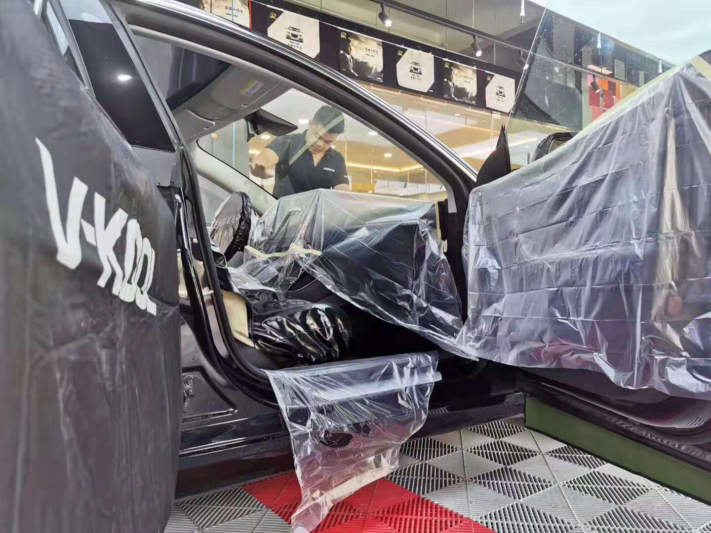 施工前全套保护措施:施工前将车内全部戴好防护装备,保护车内内饰不受潮,不损伤。