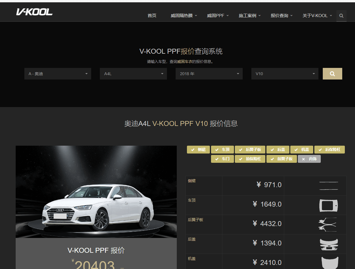 其实,威固汽车贴膜多少钱主要取决于选择的威固车衣型号、汽车类型和施工门店收费情况。车艺尚威固官方旗舰店的威固车衣价格公开透明,没有不透明收费,到店贴膜放心。如果你想获得不同车型贴威固车衣的价格,可在报价系统上进行查询(https://www.v-koolsh.com/qvkoolppf/23/A4L/2018/V10),选择具体的车型和威固车衣型号点击查询即可获得参考价格。当然,这些价格仅供参考,自己汽车具体的价格最好电话官方客服400-808-1165做一对一咨询,报价更准确,贴膜也更放心。