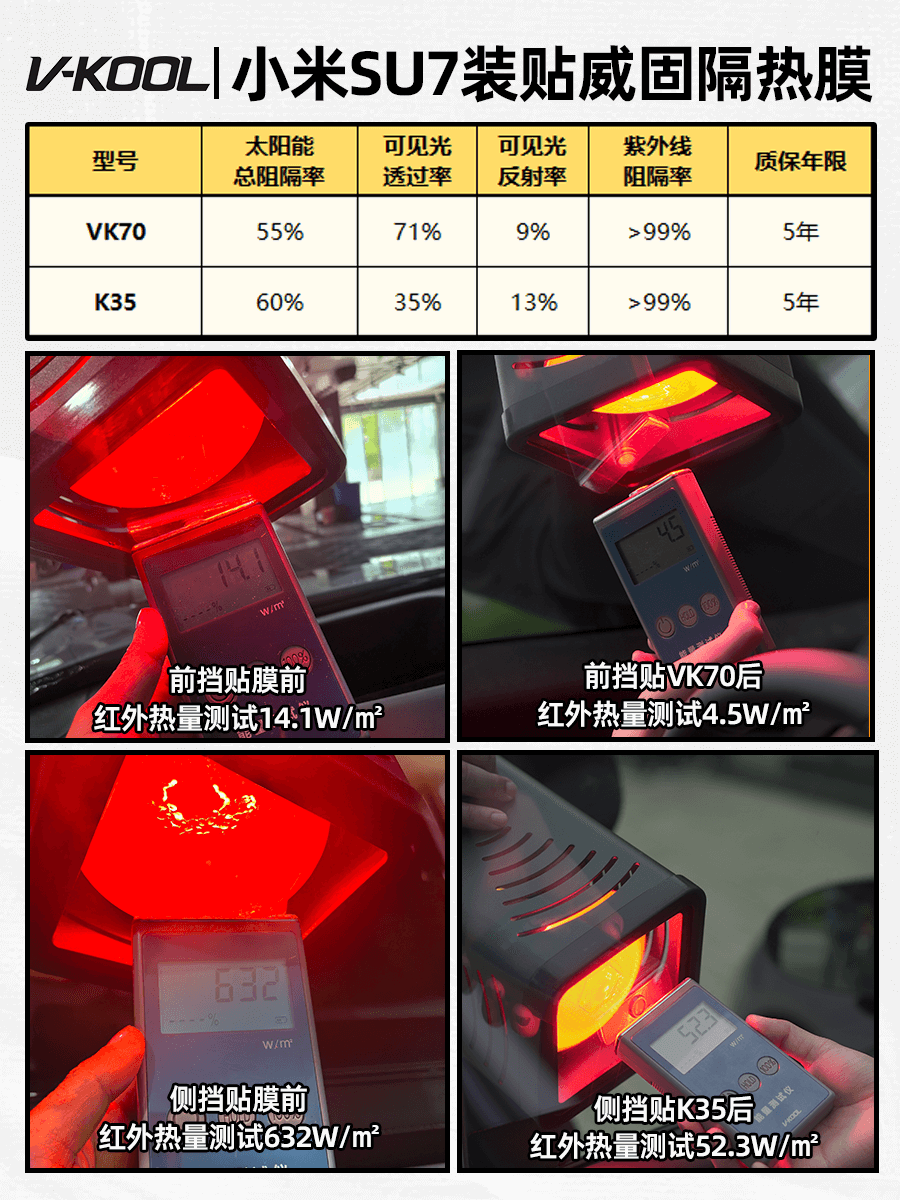 小米su7施工威固隔热膜前档VK70+侧后档K35效果: