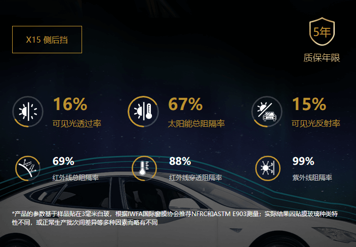 威固X15同样是常规系列中的一款深色金属膜,其太阳能总阻隔率为67%,在这三款产品中隔热效果最佳。X15的可见光透过率为16%,可见光反射率为15%,透明度和法氏囊眩光性能比K15略低,但保持了较高的隔热性能。如果对隔热效果有较高要求,X15是一个不错的选择。