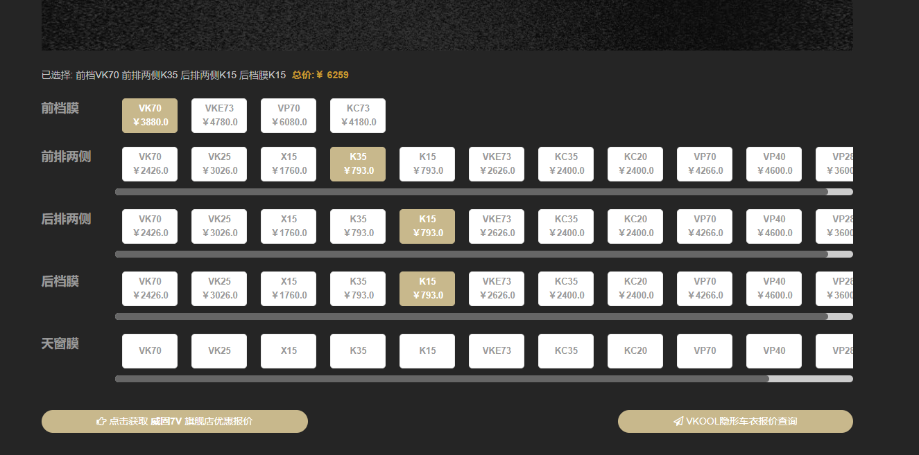 下方标有不同部位不同型号汽车玻璃膜的价格,可以根据自己需求选择搭配,总价也会随着改变。