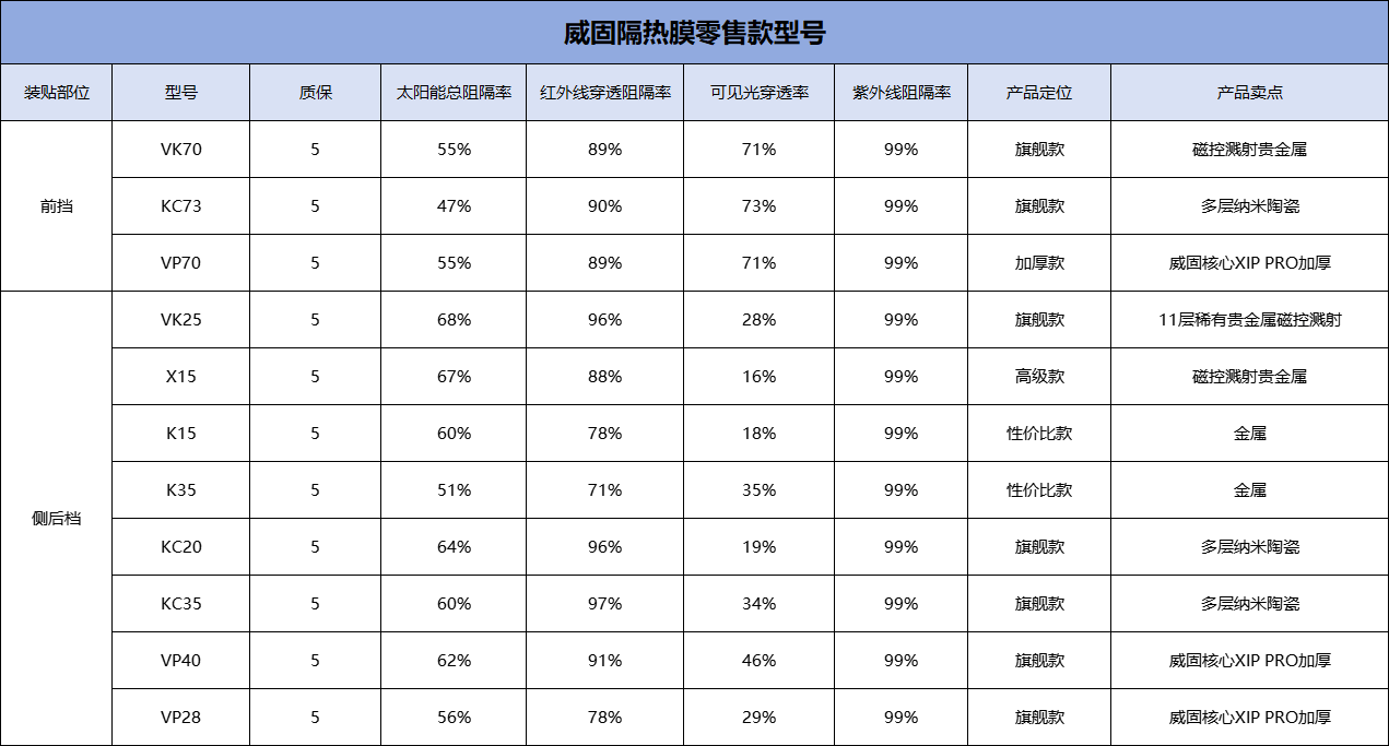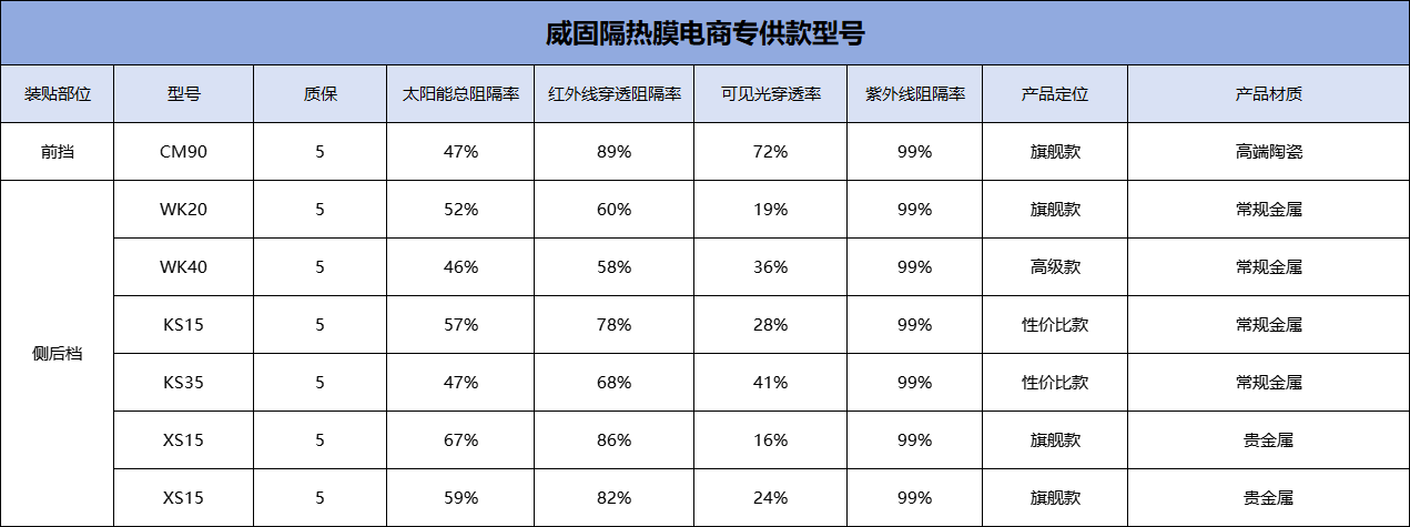 电商专供系列的威固玻璃膜,除了CM90是前挡玻璃膜外,其他型号都是侧后挡。电商专供系列和零售系列的主要区别就是侧后挡的不同搭配,具体玻璃膜型号参数如下表所示:
