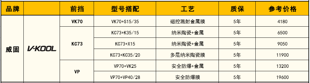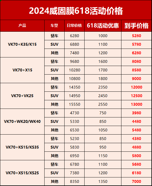 今年威固618活动主要针对前挡为VK70玻璃膜的全车贴膜搭配,除了以上组合外威固还有很多全车贴膜组合,具体价格分别如下所示: