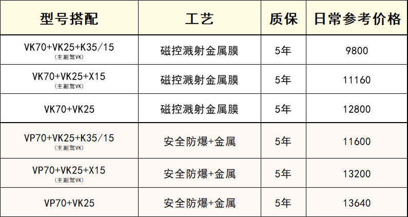 威固VK25经常会被与前挡膜VK70、VP70搭配贴;也会加入其他侧后挡深色膜,在全车贴膜中专门用来贴侧前挡车窗,以便有良好的视觉清晰度,保障驾驶视野,提高出行安全系数。威固VK25全车贴膜价格在9800元-14000元左右,具体参考价格如下:
