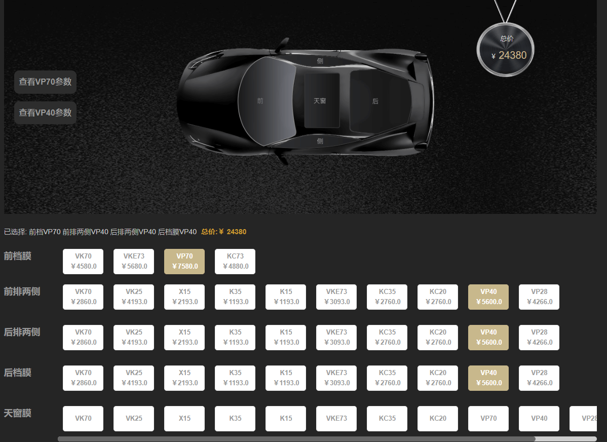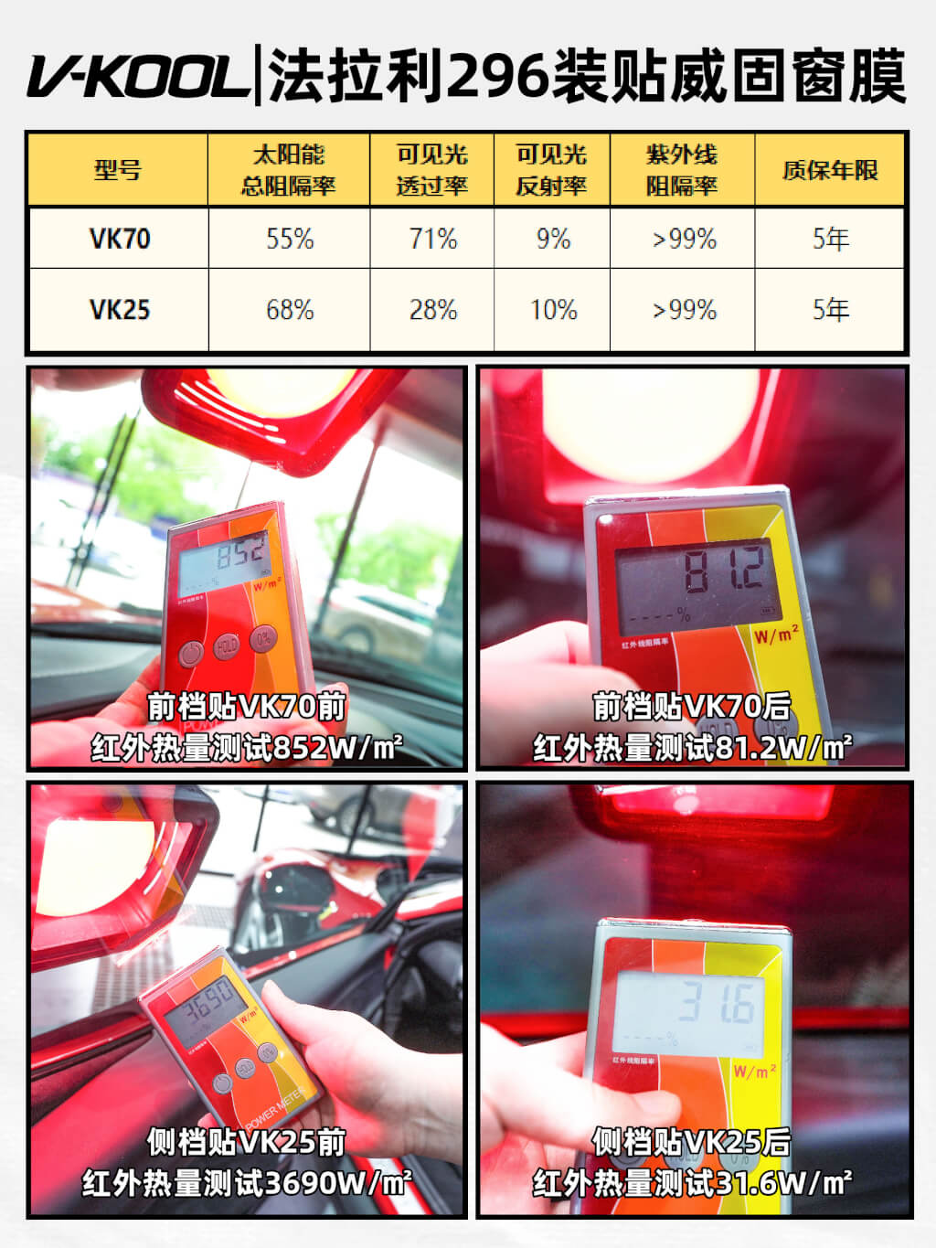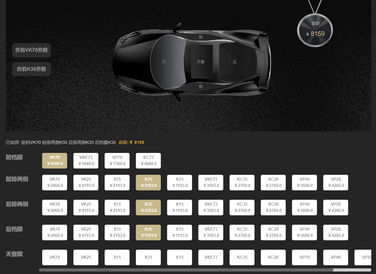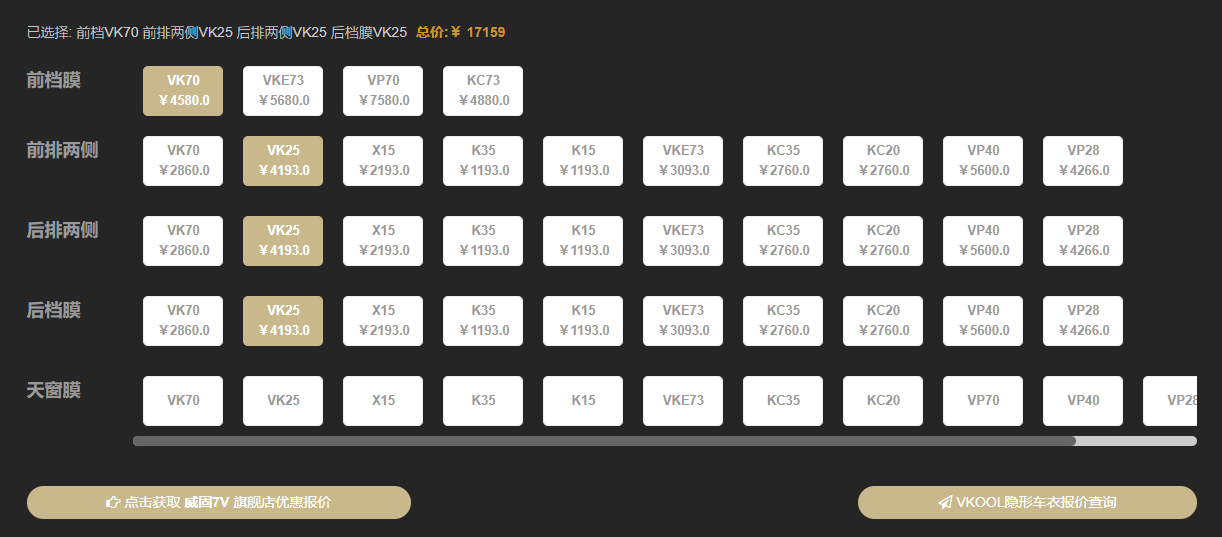 如果预算有限,可以考虑威固高性价比组合VK70+K35,全车贴膜价格更实惠一些。