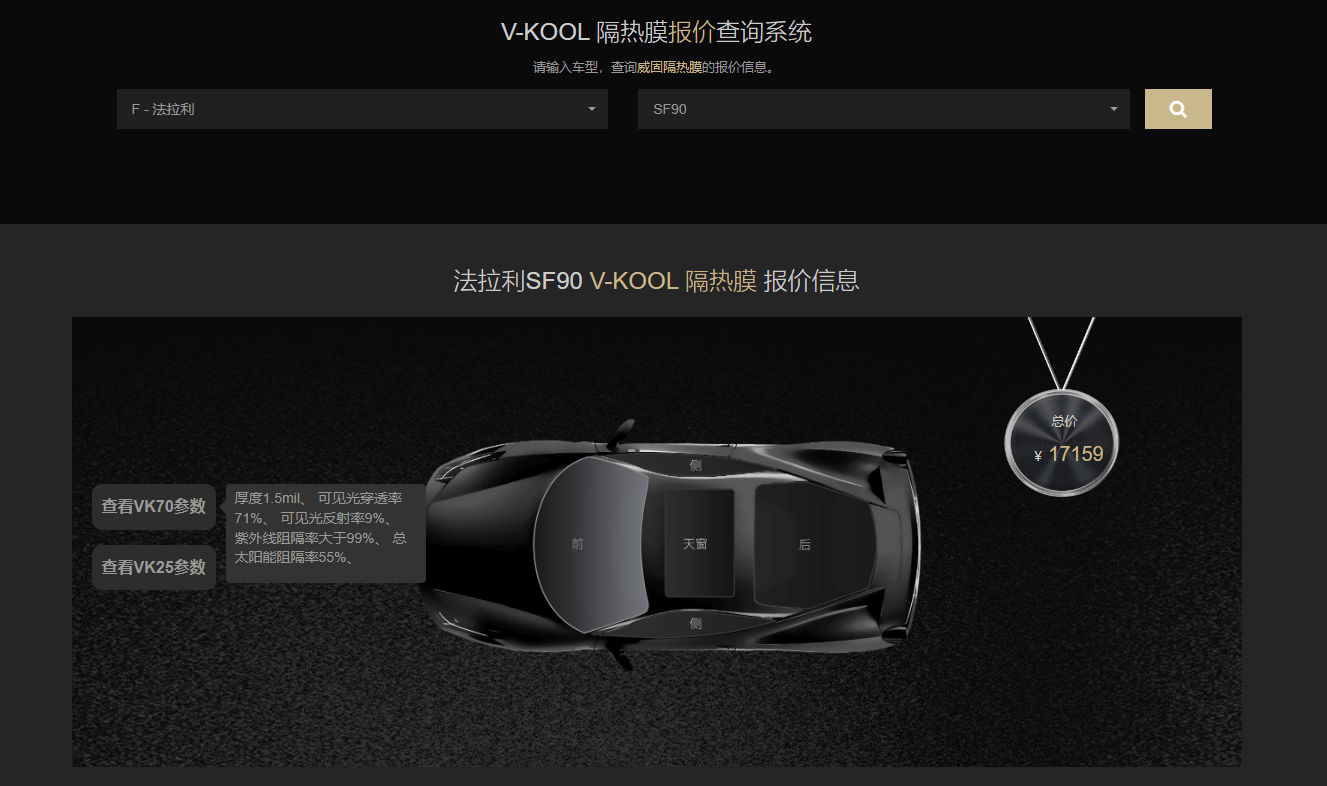 威固汽车贴膜讲究专车专家,不同车型即使贴同一型号威固膜,其全车贴膜的价格也会不 同。车主可借助威固隔热膜报价系统查询不同品牌不同型号汽车贴膜价格。法拉利汽车型号众多,此次以法拉利SF90为例进行查询。