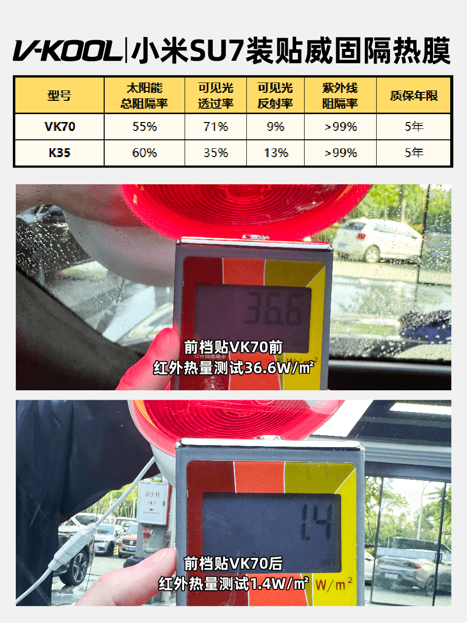 KC73是威固纳米陶瓷膜的代表,不干扰信号,适合新能源车。K35/15侧后挡磁控溅射金属膜,提供一定的隐私保护与隔热性能