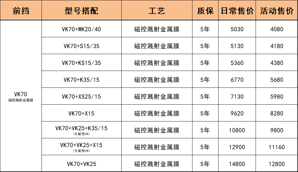 前挡VK70 + 侧后挡WK40/20:约4080元